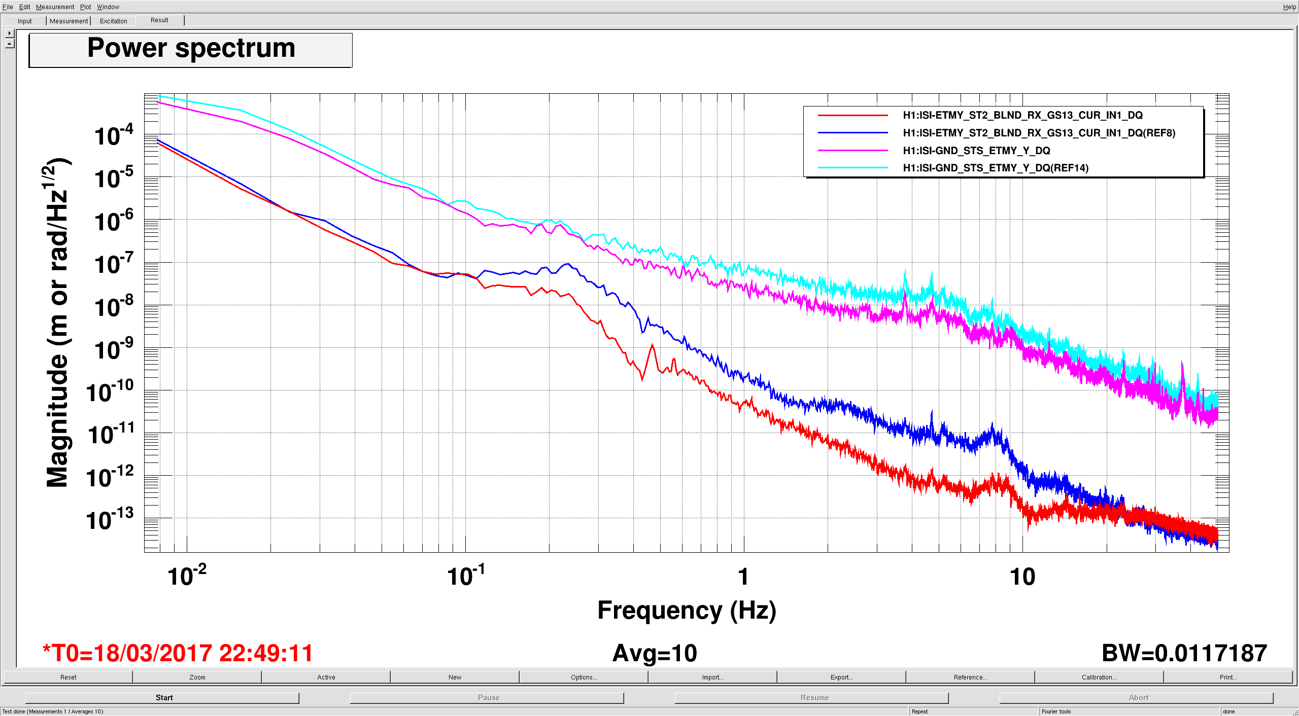 The first plot shows the St2 RX/RY GS13s and you can see the the table is moving less between .1-20hz (blue is the "high wind" state, red is nominal), while the wind had dropped off a little (cyan to pink).