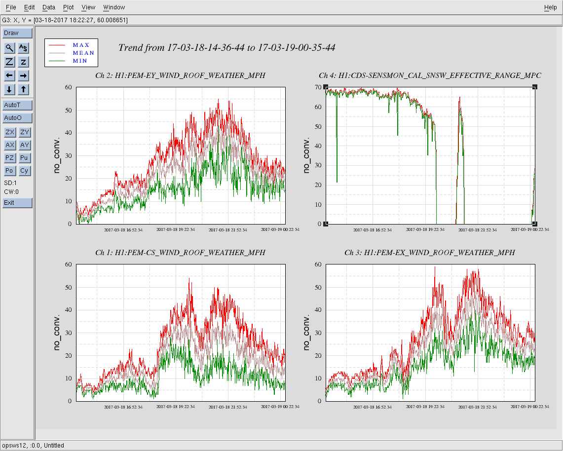 TITLE: 03/18 Eve Shift: 23:00-07:00 UTC (16:00-00:00 PST), all times posted in UTC STATE of H1: Observing at 67Mpc INCOMING OPERATOR: Ed SHIFT SUMMARY: Winds have subsided to below 20 mph. No major issues after going back to observing. SEI is back to its nominal state (Jim W. was here after Travis lost lock due to the wind). If the winds come back up Jim W. has suggested trying the newly created 'MORE_WINDY' SEI state (see his alog). LOG: 23:29 UTC Starting relocking. 23:51 UTC Took about four tries to get past CHECK_IR. 00:00 UTC Lock loss from SWITCH_TO_QPDS. 00:23 UTC Stopping at DC_READOUT_TRANSITION. Jim W. ramping off sensor correction. 00:25 UTC Jim W. switching SEI back to nominal. 00:39 UTC Observing. 01:02 UTC Jim W. leaving. Changed sign of gain to damp PI mode 28. 01:08 UTC Changed phase to damp PI mode 27. 06:46 UTC The bottom monitor connected to nuc6 lost its signal for ~ 20 sec.