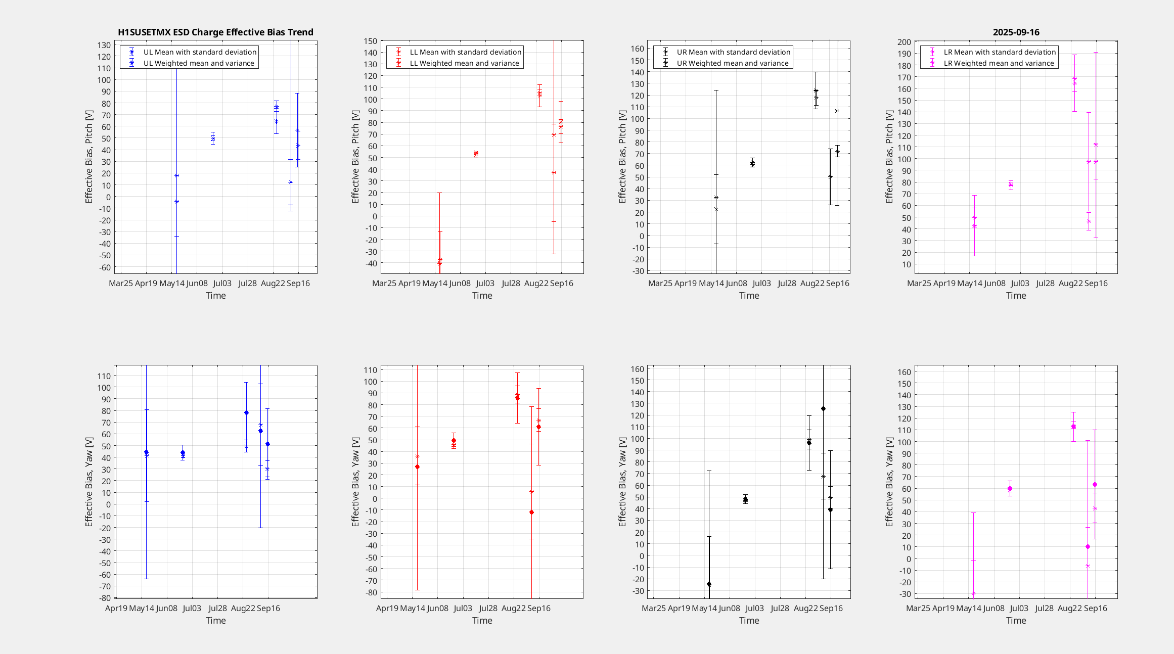 I tried to get a better measurement of the ETMX charge per its OPLEVs this morning, I started with a higher gain on the ESD_OUTPUT filters than the last time (0.75 instead of 0.5, 1 worked until recently). This measurement had pretty low coherence like last week so I ctrl+c and increased the drive_amp by 20%. This measurement was a little better but still not as good as I would like it, and as we have had in the past, so I restarted it again with another 20% increase in drive_amp, I ran 3 measurements with this configuration. The prelimary processing looked decent but the full processing revealed pretty large error bars still.