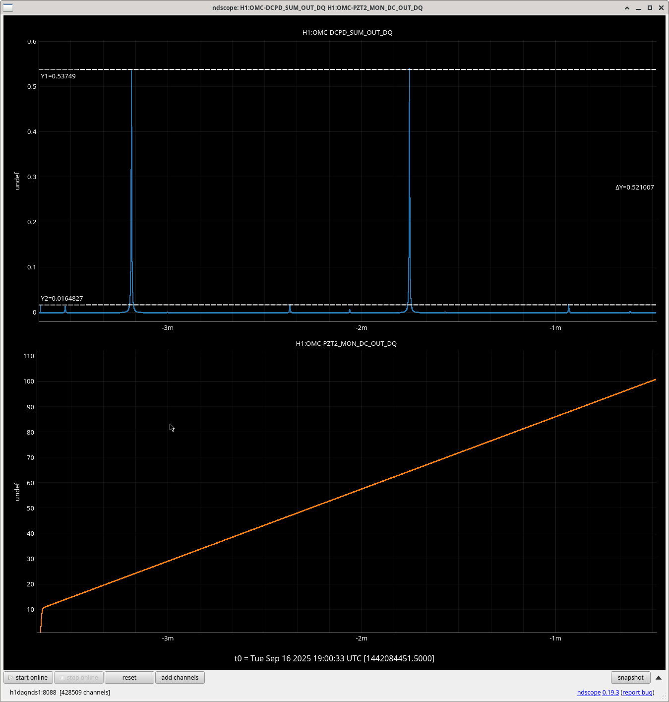 Followed setup instructions from 80010, last done in 86445. Increased to 75mW injected in the SEED beam, we had 1mW on OPO_IR_PD_DC. Have counts of ~60 and 66 on ASC-AS_A and B and 7e-4 on ASC-OMC-A and B NSUMs all similar to the August 19th measurement. To turn on the OMC ASC, H1:OMC-ASC_MASTERGAIN to 0.02. Took H1:OMC-PZT2_OFFSET goes down to -50 to start and then ran a template /sqz/h1/Templates/dtt/OMC_SCANS/ Sept16_2025_PSAMS_OMC_scan_coldOM2.xml ref 35,36.