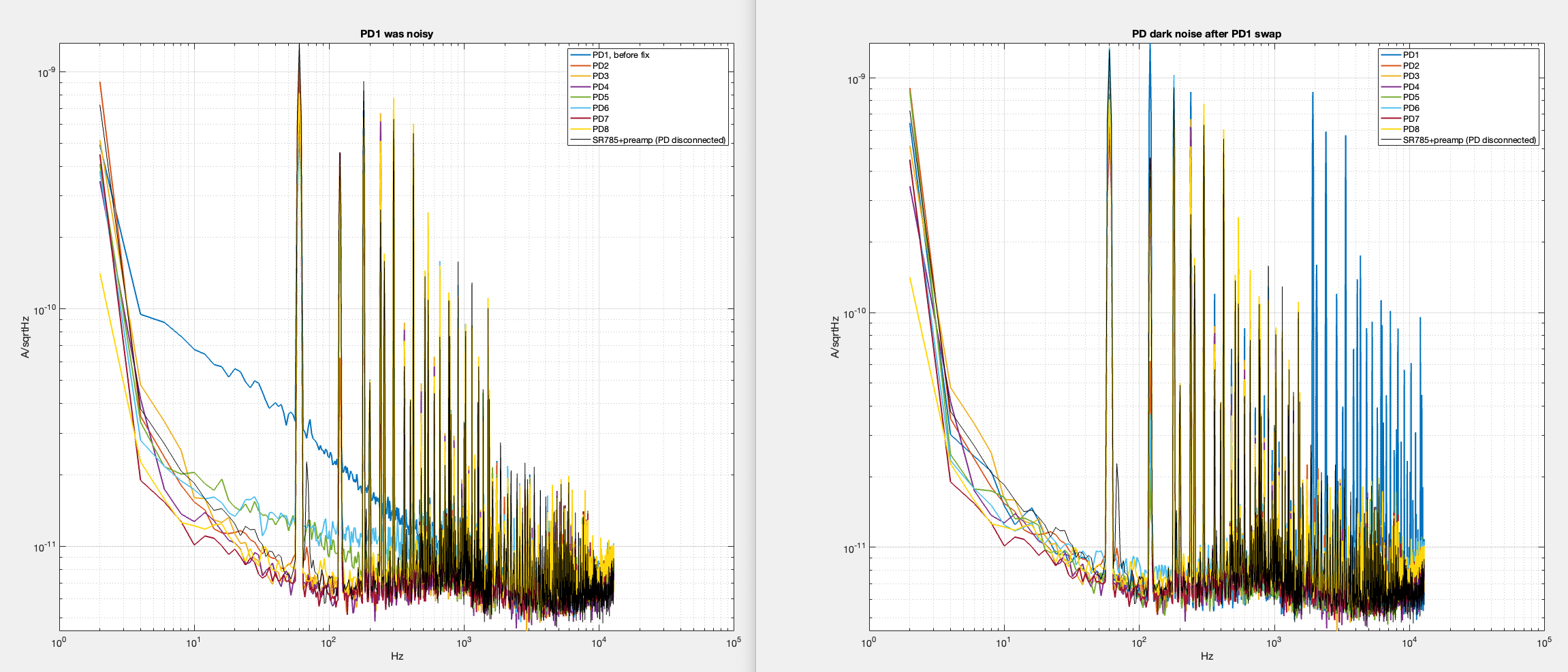 Note: Even though the plot title says "dark noise", the measurement is limited by the preamp noise and SR785 input noise (black trace). But this at least tells us that no PD is extra noisy. FYI the shot noise level for 10mA current is ~5.7e-11A/sqrtHz.