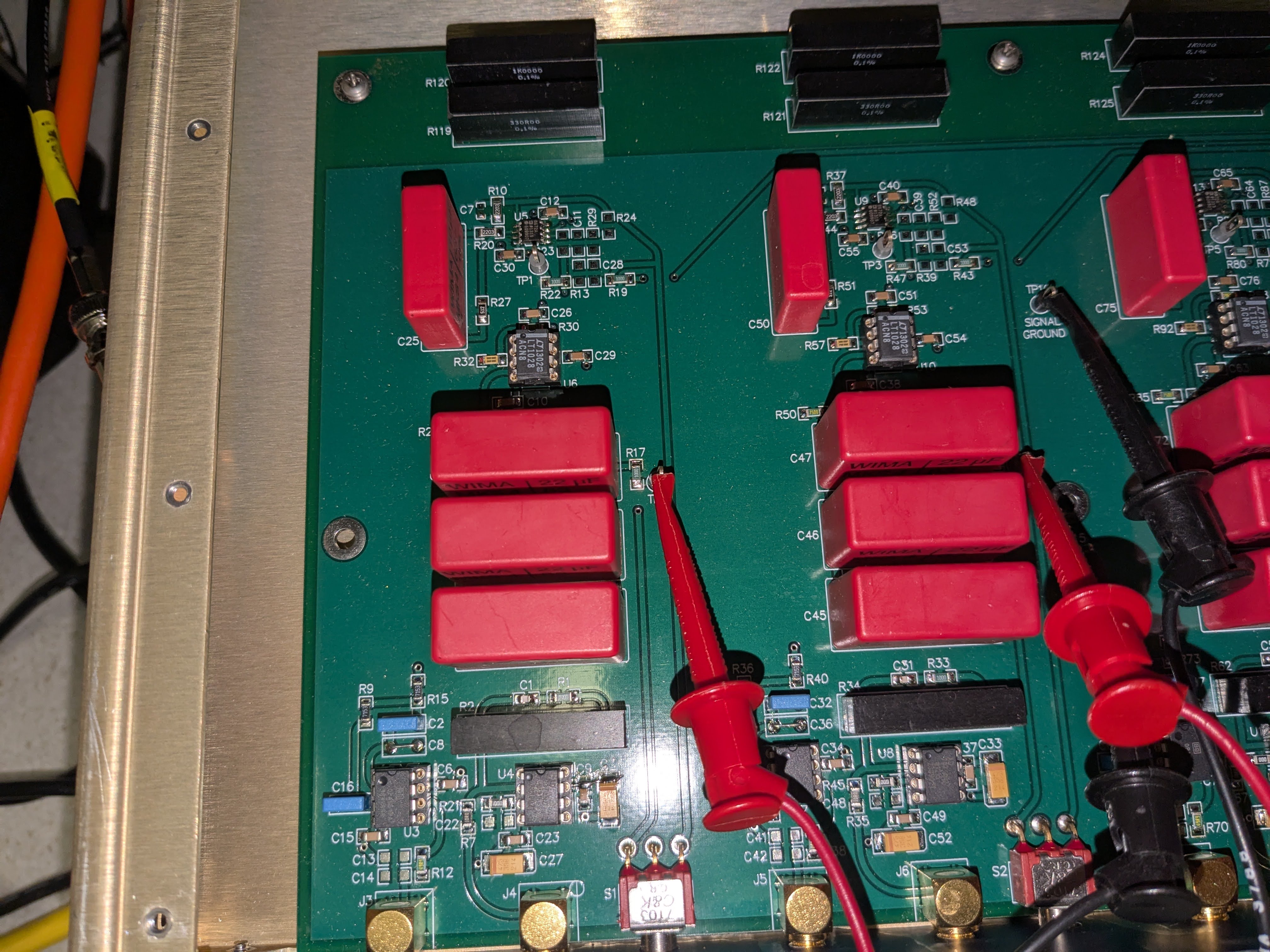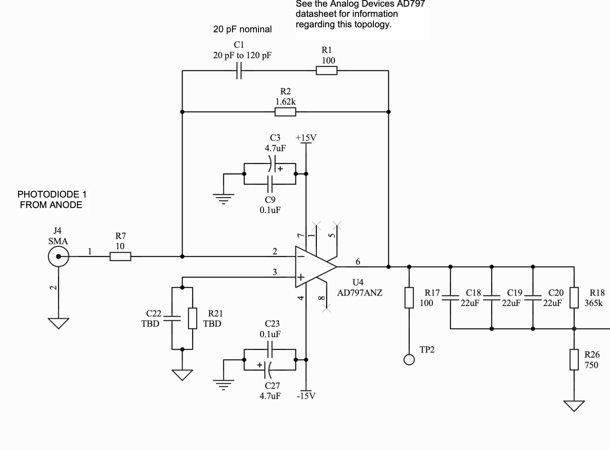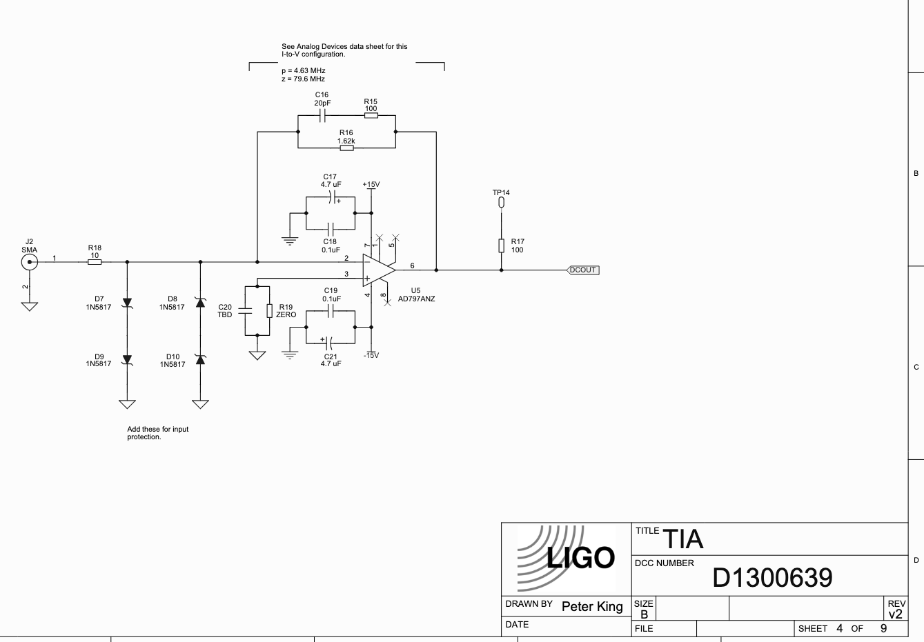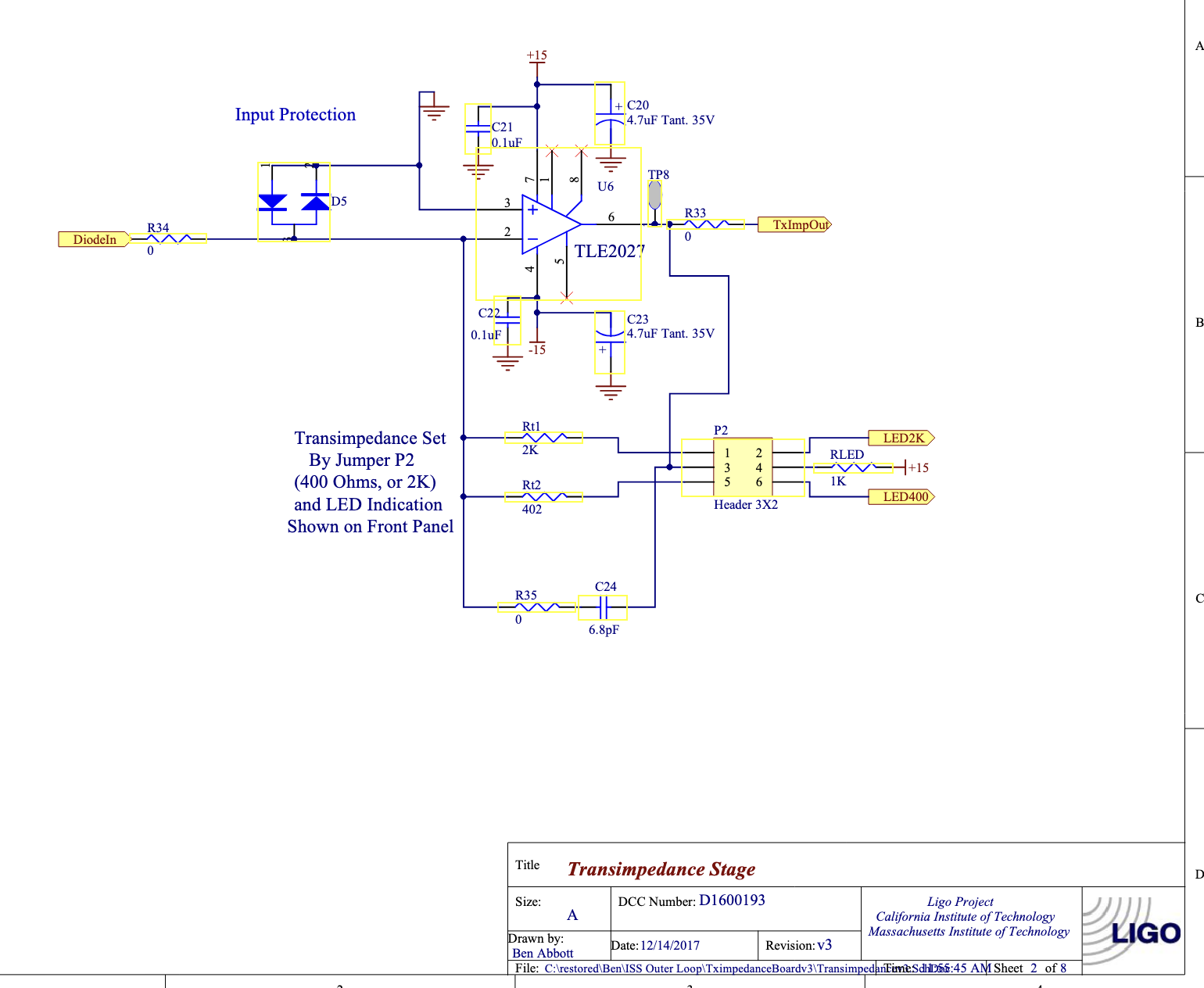 The preamps are clearly labeled as D1300639-V2 (5th attachment), but the e-traveler for these boards (S1301390 and S1301386) say they're V1, and the actual board pattern (e.g. the first channel TIA opamp is U4, the transimpedance itself if R2 and the output of TIA opamp is connected to TP2 via R17, see the 7th screen shot) agrees with V1 (2nd screen shot) but not with V2 (6th screenshot).