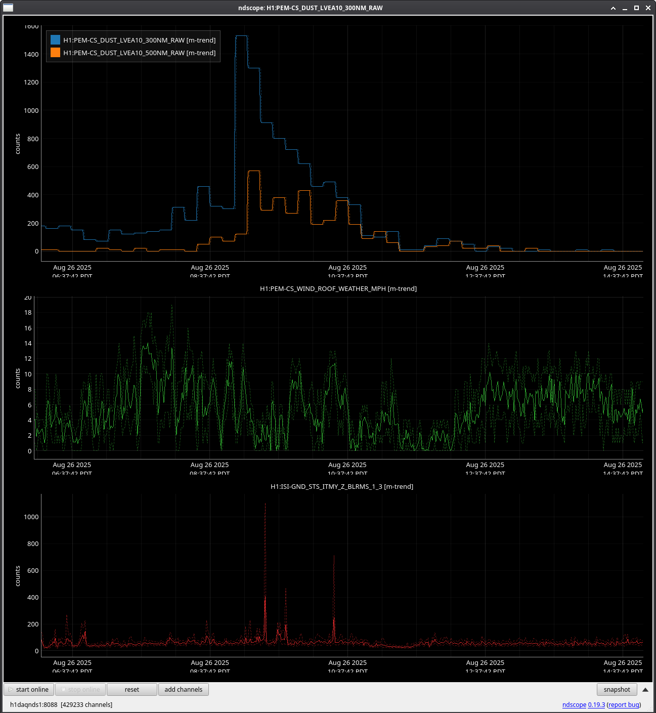 Attached a zoomed-in plot of the DM10 channels just around the maintenance period on Tuesday, Aug 26th while craning was happening overhead. Dust counts certainly spiked mid-morning, which is likely when craning was happening as seen by ITMY STS BLRMs.