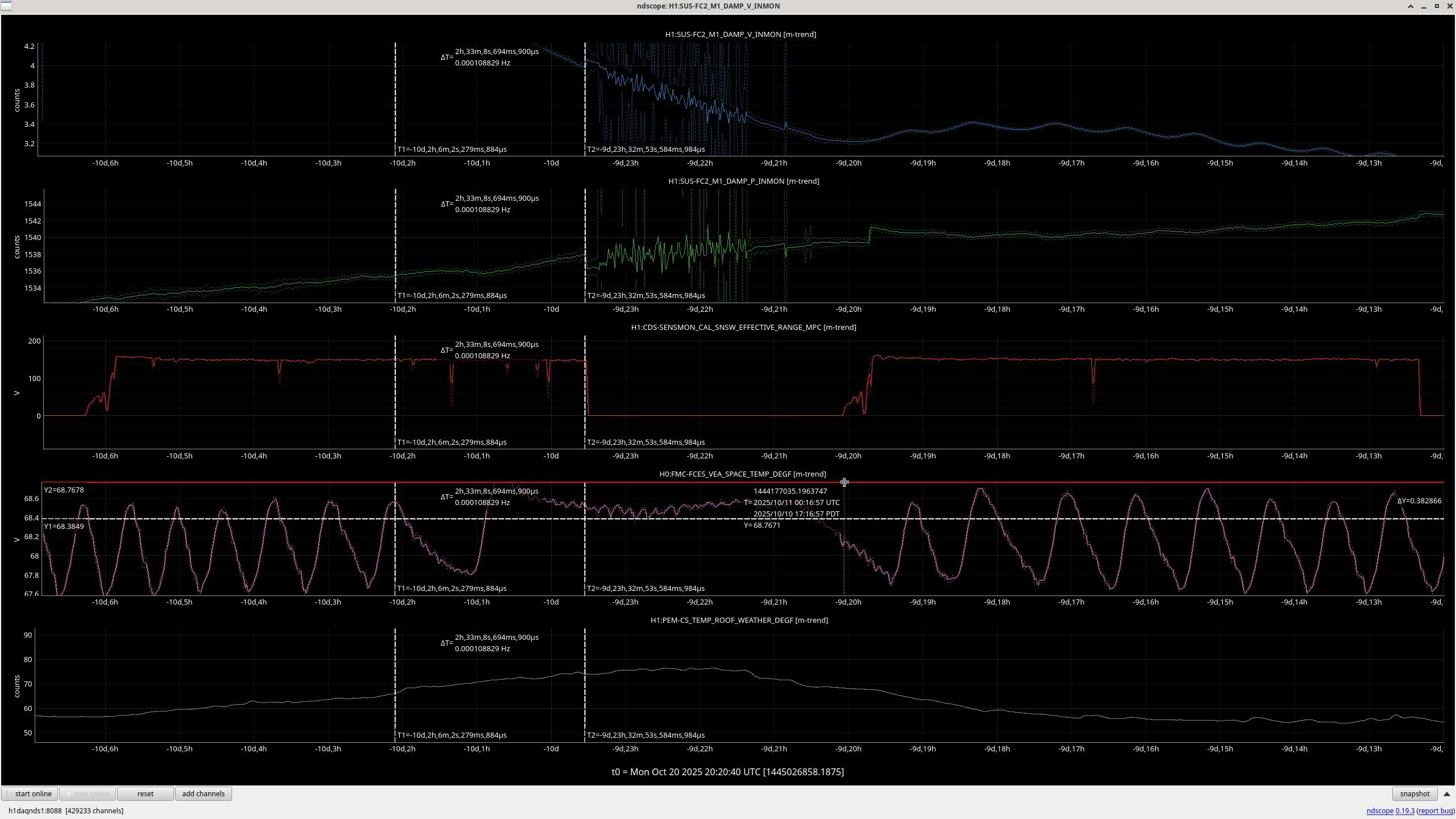 In investigating FC2 temperature trends to try and optimize SQZ, I ran into an oddity with FC2 OSEMs that was also seen by the FCES VEA Temps. Running through potential causes with TJ, we ruled that this was not a cause of H1 being unlocked since the other times H1 is unlocked don't have nearly as much noise in FC2.