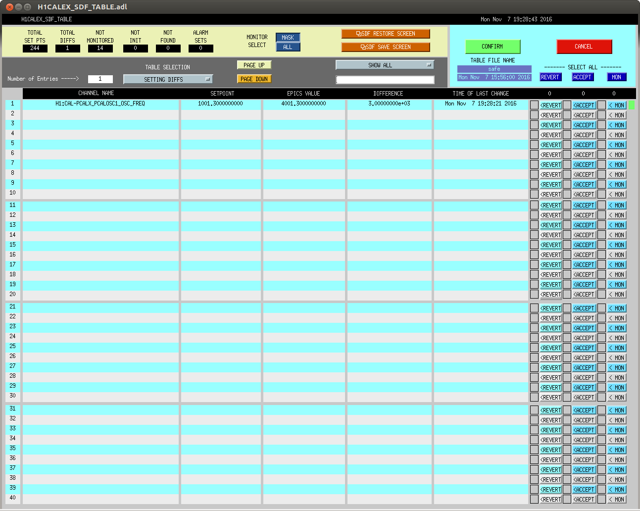 If h1oaf gets booted and the chillers go down, you only need to restart the chillers at the front panel and the lasers at the racks on the floor. The TCS settings come back up properly with the safe.snap. If the front end is not up yet, the SDF may show some stale setting diffs. Ignore anything in SDF until the FE is back up - most of these diffs will take care of themself as many are servos that do automatic adjustments.