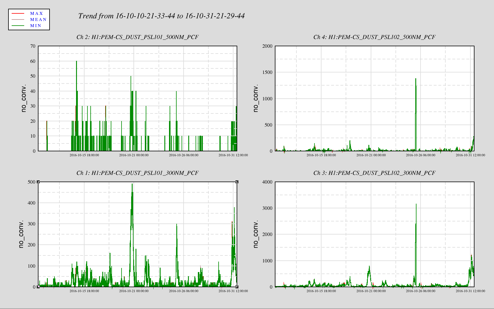 Peter K., Jeff B. Today there have been elevated dust counts in the PSL laser room and in the Anti-Room. Trends over the past few weeks show several spikes of high counts in both rooms. The alarm level settings for the Anit-Room (DM 102) are set for clean 1000 (Minor alarm 700 counts, Major alarm 1000 counts). The PSL enclosure is set for Minor alarm at 140 counts and major alarms at 200 counts. We are still looking into the cause of these spikes. P.S. Ops - Please let me know if you are getting dust monitor alarms and what the wind is doing at the time of the alarms.