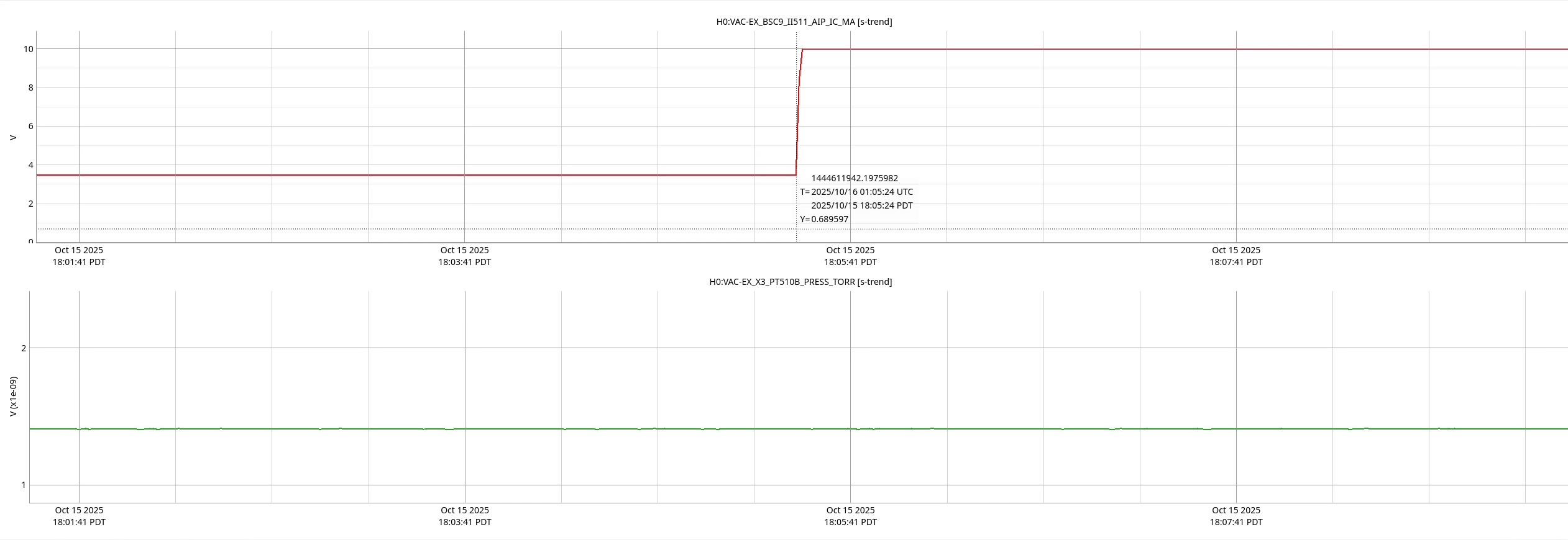BSC9 annulus ion pump (AIP) railed yesterday around 6:05 pm local time, railing is noted on the plot with the red trace. The annulus system will be diagnosed on next opportunity.