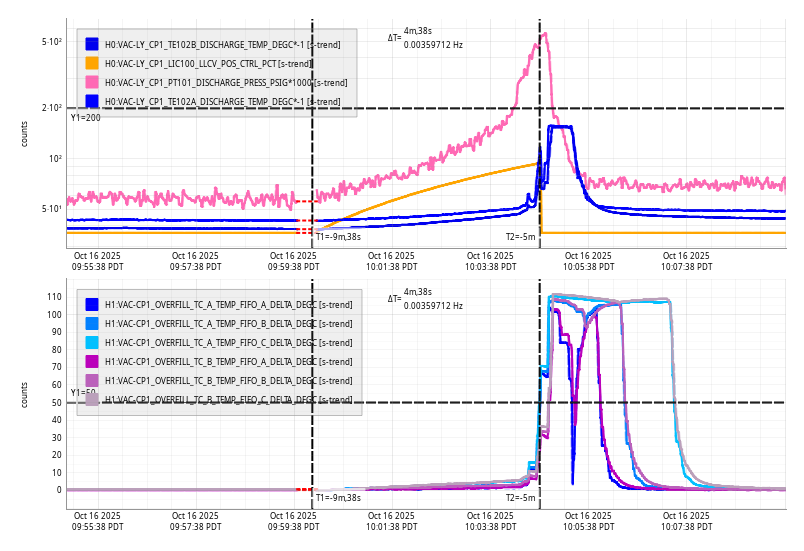 After the pump railed there is no noted effect inside the main vacuum envelope, noted on the green trace on the attached plot.