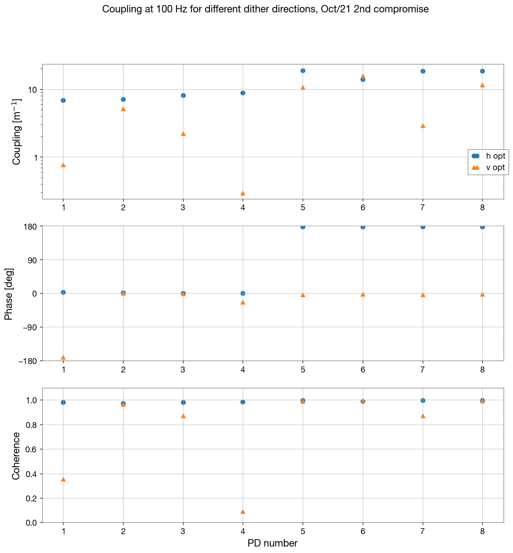 Using the example of this particular measurement, if you choose PD1/2/3/4 as the in-loop PD, the jitter coupling of the combined signal is roughly mean(6.9,7.1,8.2,8.8)=7.8 RIN/m horizontally and mean(-0.77, 5.1, 2.2, 0.3) = 1.7.