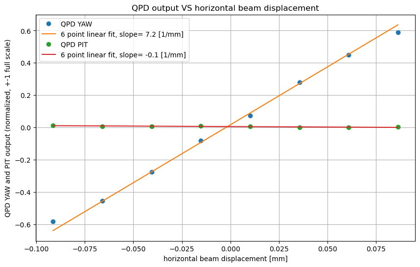 We used a PZT-driven mirror to modulate the beam position, which was measured by the array QPD connected to ON-TRAK OT-301 preamp as explained in this document in T2500077 (though it is misidentified as OT-310).