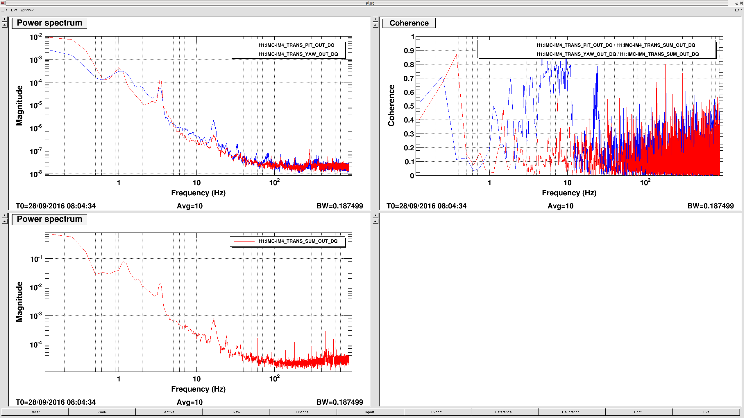 - IM4 relative beam jitter (PIT/SUM, YAW/SUM): 2-5e-8/rtHz (plot 1)