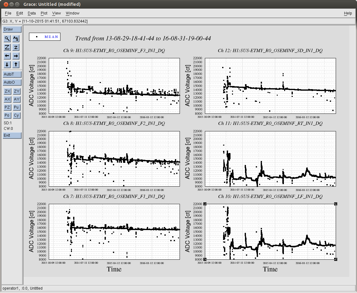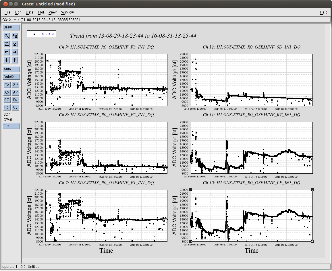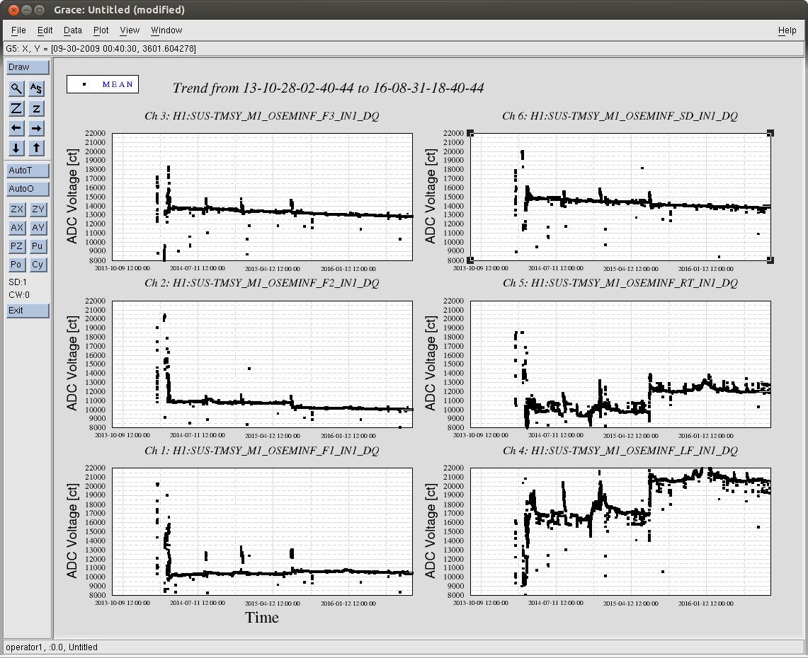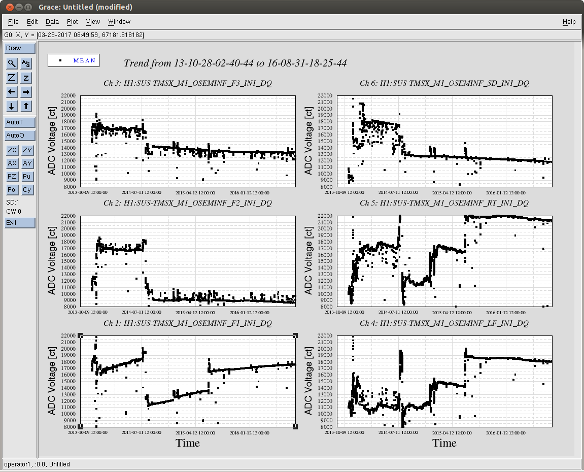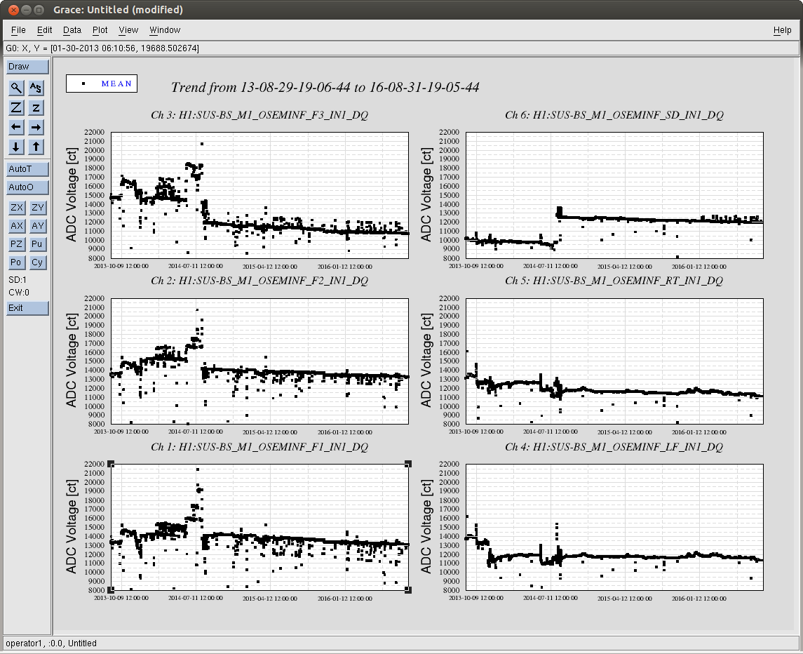 J. Kissel While perusing the list of FRS tickets / Integration issues that had been opened and related to me, I found an old issue -- now FRS #3246 -- that cites LHO aLOG 19208. The story from that aLOG : after the vent in the summer of 2015, the LF & RT OSEM signal chains had shown a factor of a few less gain than their values prior to the vent. I was tempted to close the issue, claiming the cop out "well, we detected gravitational waves with TMSX like this..." but there happened to be some time this morning, where then end stations were free. Also, given the typical-forgetten-about state of the TMTS, this transfer function had not been remeasured since just after the pump-down of the chamber -- not at final vacuum levels. As such, I've remeasured the standard top-to-top transfer function of H1SUSTMSX, and found even further a drop in transfer function magnitude. The transfer functions confirm that V and P -- transfer functions show a factor of 4 drop in response from the 2014 to 2016 measurements. Additionally, and not mentioned in the original fault (although present in the 2015 transfer functions) report R also shows a drop from 2014 to 2016 of a factor 2. See first pdf attachment (alltmtss_2016-08-31_Phase3b_H1SUSTMSY_M1_ALL_ZOOMED_TFs.pdf). The drop in plant gain leaves the R, P and especially V DOFs with little to no damping on resonance. Digging even further, recall that TMTS top masses (M1) are rotated 90 deg to that of the QUAD, so the DOF mapping (for the relevant DOFs in question) is V --> LF and RT R --> F1, F2, and F3 P --> LF and RT Since L (= SD), T, and Y (= F2 and F3) look the same, we can rule out problems with F2, F3, and SD. This leaves LF, RT, and F1 as our suspect OSEMs. Unlike suspected before, I'm not sure if this is an external electronics chain issue. Why? Because, typically electronics chain problem show up clustered in an entire satellite amplifier or coil driver. The TMTS OSEMs are group in the typical six-osem stage fashion of F1, F2, F3, LF on one cable chain, and RT, SD on another (see pg 3 of D1002741). I've also attached some new figures (which are standard output of the transfer function scripts, but posting them had fallen out of fashion) that compares the response in the OSEM basis to Euler basis drive. This isolates the individual sensor composition of each DOF. See the rest of the .pdf attachments ( H1SUSTMSX_M1_*.pdf), which compare the 2014 and 2016 data sets in this manner. This shows a consistent story, that - F1 alone (as opposed to F2 and F3) has dropped in sensitivity by a factor of 2. - LF has dropped in sensitivity by a factor 6, and RT has dropped by a factor of 3. I then went on to wonder -- seeing the trend from 2014 to 2016 -- have the OSEM LEDs just slowly decayed in sensitivity over time? This launched the data viewer mining exercise for all of the attached .pngs, H1SUS${OPTIC}_${TOPSTAGE}_OSEMINF_3yr_Trend.png. These are hourly trends of the mean value for each OSEM over the past three years. I was hoping to see the H1SUSTMSX's F1, LF, and RT OSEMs showed a slow, but substantial, downward decay in raw input ADC voltage over time, with the hypothesis that this represented a slow failure of those OSEM's LEDs or PDs. Sadly, evidence from other suspensions I checked showed that a random smattering of BOSEMs scattered around all BSC SUS show either flat or a slow decay of at most ~3000 [ct]; the rest are flat in time. This drop in PD current is only about 10% of the full range (~30000 [ct]), so it cannot explain the factors of 2 to 6. In conclusion, I've recommended that we close this ticket with the LONGTERMFIX, and open up a proper Integration Issue about it, marking it WHEN VENT, because I have a feeling this will be easier to debug when we have access to the entire signal chain. In the mean time, we can band-aid the problem by increasing the overall gain the V, R, and P damping loops by the amount of plant sensitivity that has been lost.