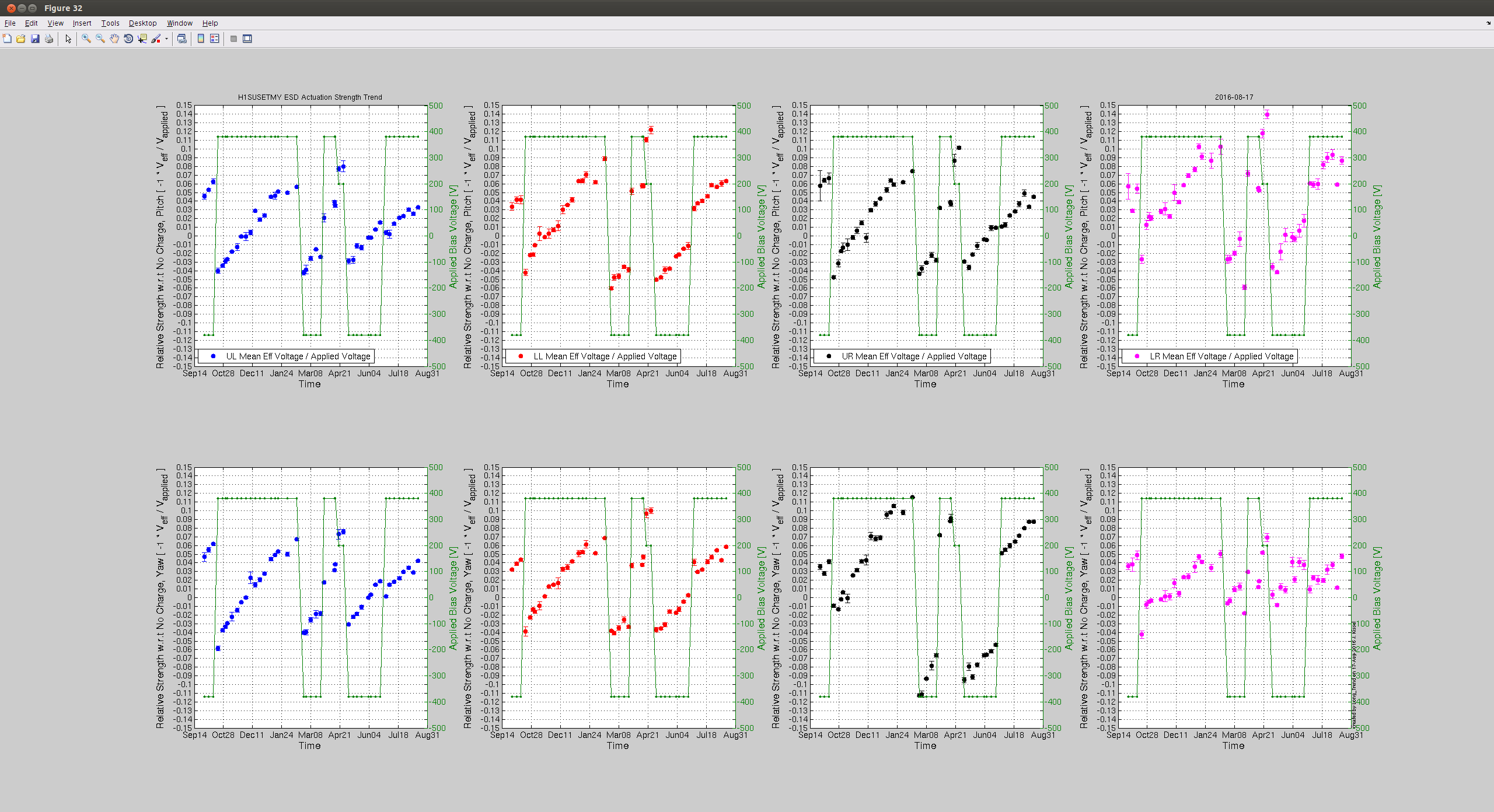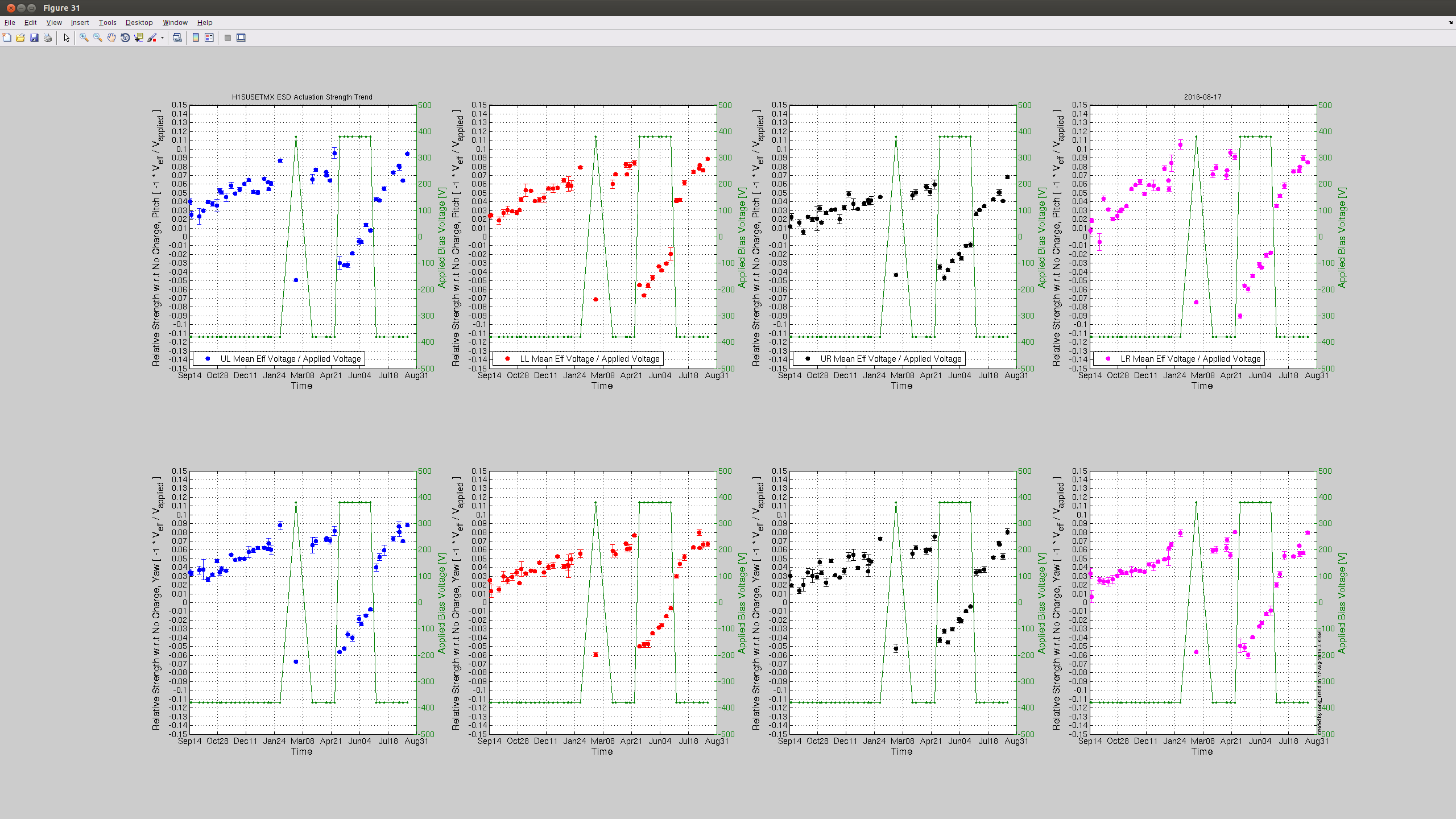 J. Kissel This is your weekly assessment of charge accumulation, resulting effective bias voltage, and actuation strength change of the ETM ESD systems. The extremes of each test mass are now showing ~30 to 40 [V] of effective bias voltage, which is an actuation strength change of ~10% from nominal. ETMX's quadrants are all consistently at +30 [V]; ETMY's quadrants are less consistent, with some showing as little effective bias voltage as -10 [V]. Sadly, we've still not fully recovered the IFO since ER9 so we've still not yet been comfortable with the lock acquisition sequence to commission regular bias flipping (or even flipping it once), but let's hope we can get there soon! (I encourage the commissioning vanguard to not wait for me to be present to try...)