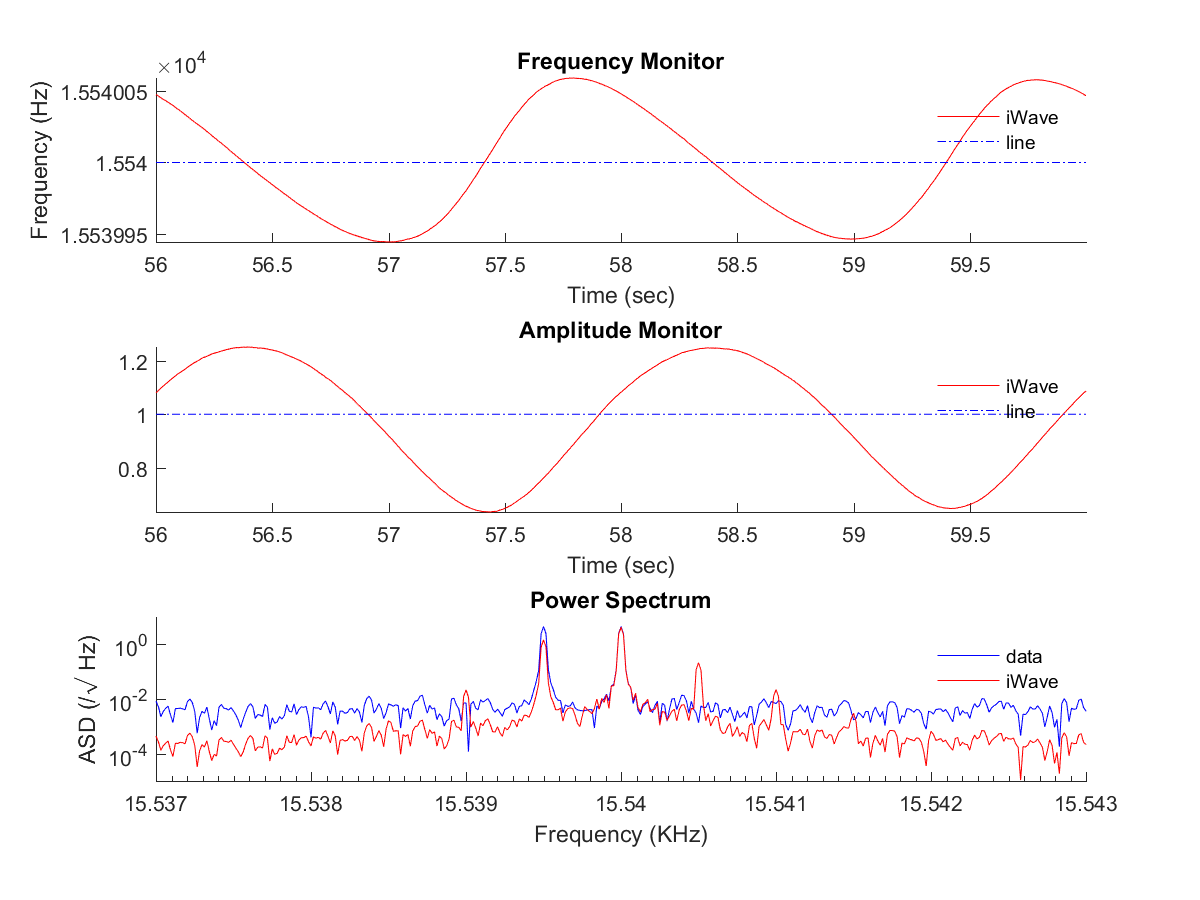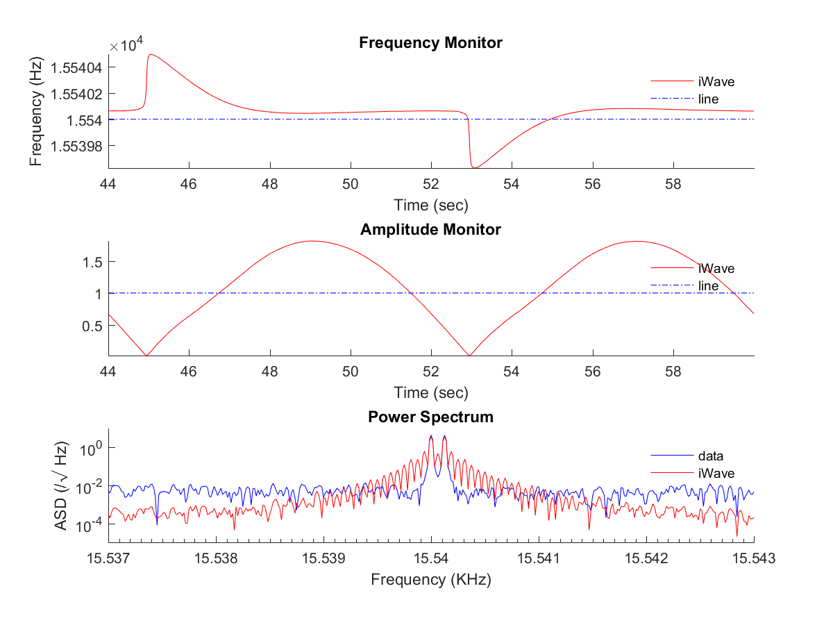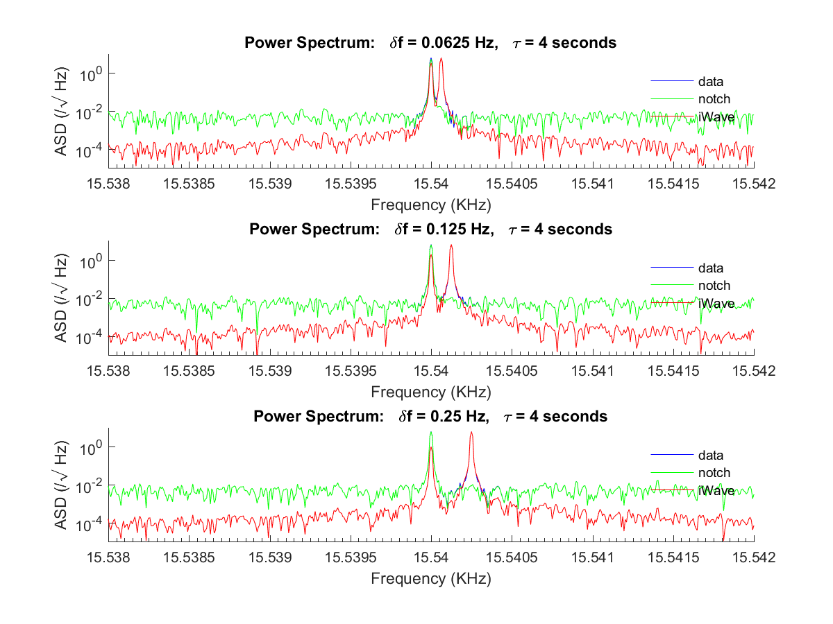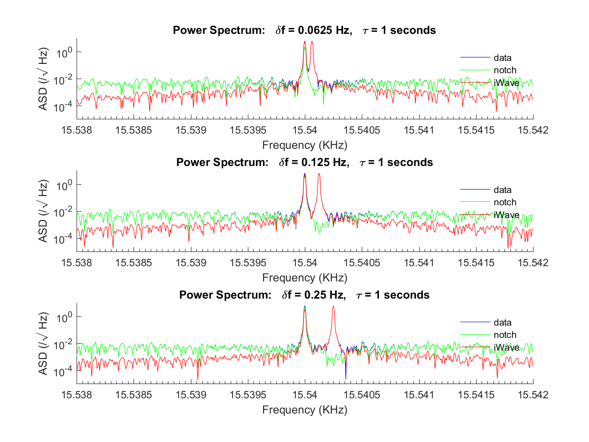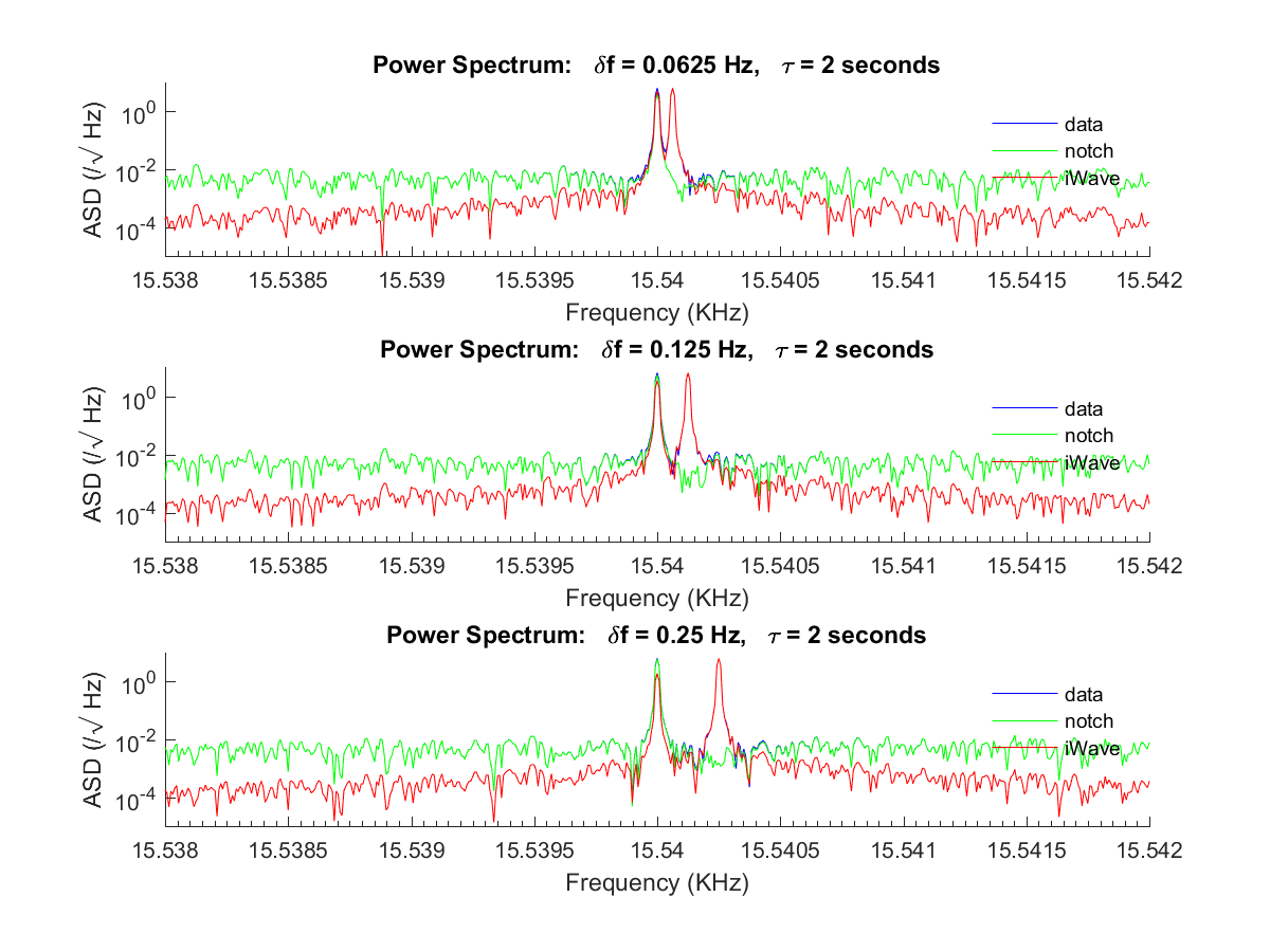 These results show that the amplitude and frequency estimate from iWave suffer modulations whose depth is inversely proportional to the frequency separation of the lines. We can also see that polarity of the frequency modulation matches the frequency difference. Thus, we can in principle distinguish between the cases where the line lies either to the right or to the left of the PI-mode of interest. The idea is to then characterise these modulations so that we can use them as error signals to control the frequency of a dynamic notch filter that is made out of iWave. The iwave notch filter is designed to remove the problematic line with minimal distortion of the background. To do this, we explore the Q-factor parameter space of iWave. The results from this study (see below) suggests that an iWave tau parameter value of 2 seconds is sufficient for separations greater than 0.0625 Hz. We see that the output of the iWave notch filter (the green line) only contains the primary 15540 Hz mode line. The next step is to use amplitude and frequency modulation error signal from iWave to control the frequency of the notch filter. If this control strategy works, we can then combine these filters into a single multi-line iWave block.