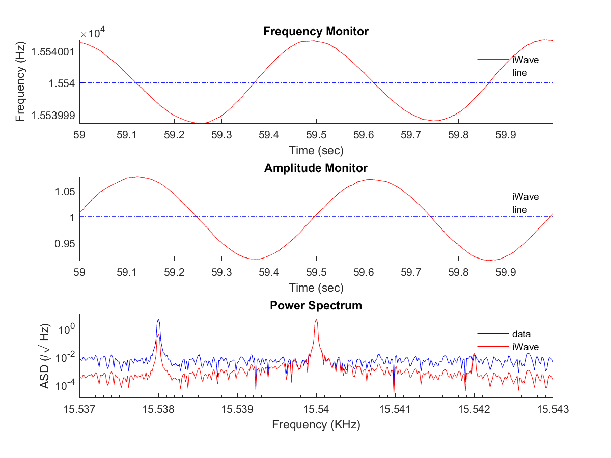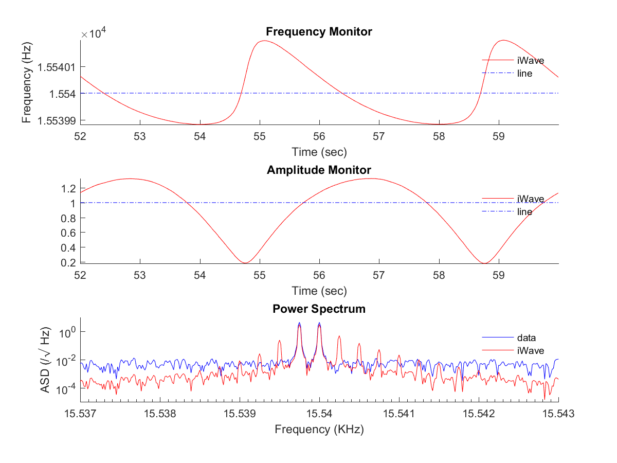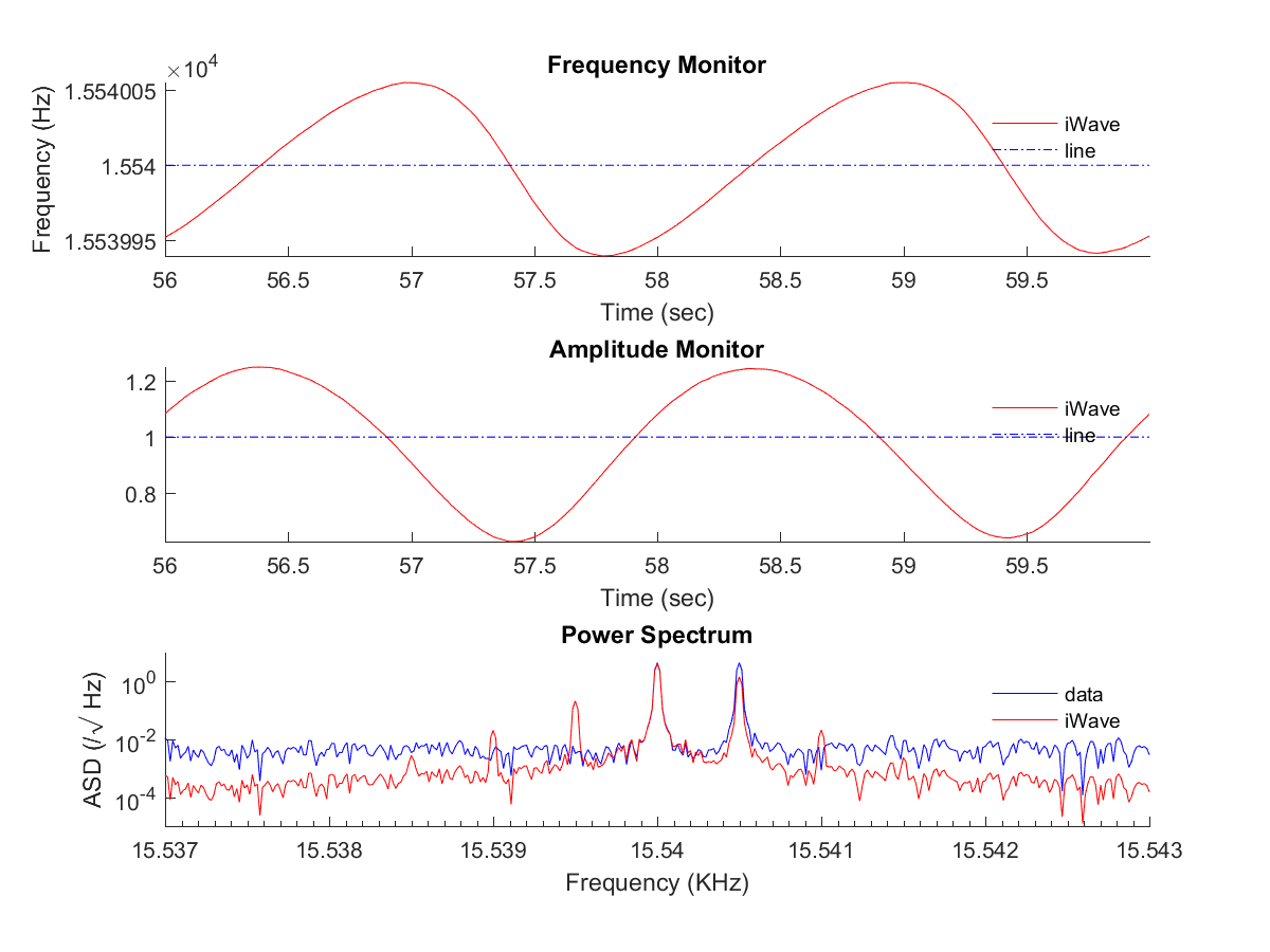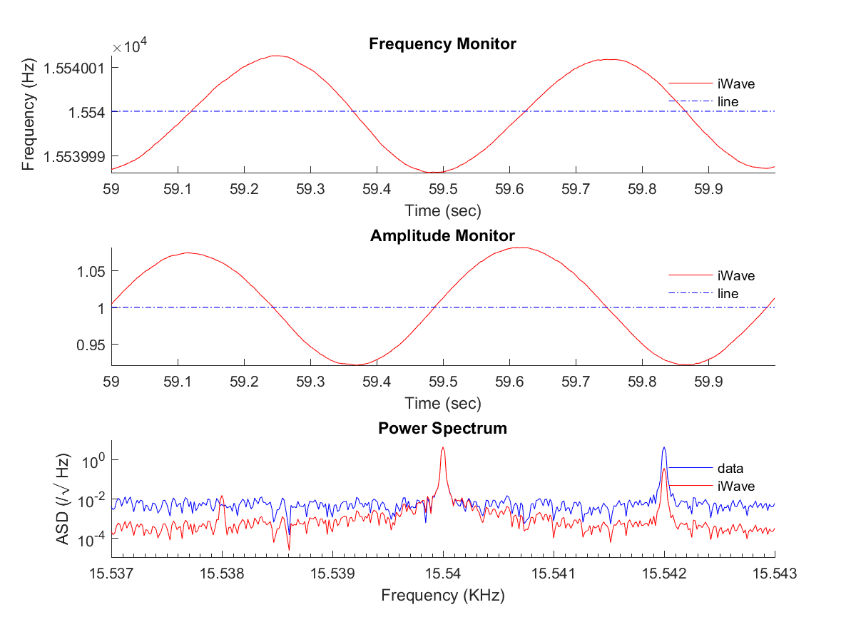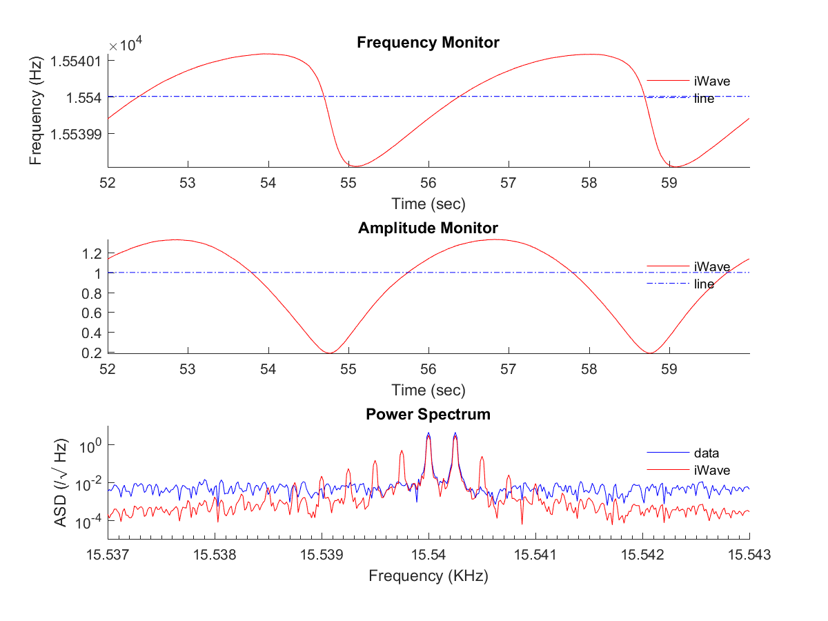 These results show that the amplitude and frequency estimate from iWave suffer modulations whose depth is inversely proportional to the frequency separation of the lines. We can also see that polarity of the frequency modulation matches the frequency difference. Thus, we can in principle distinguish between the cases where the line lies either to the right or to the left of the PI-mode of interest. The idea is to then characterise these modulations so that we can use them as error signals to control the frequency of a dynamic notch filter that is made out of iWave. The iwave notch filter is designed to remove the problematic line with minimal distortion of the background. To do this, we explore the Q-factor parameter space of iWave. The results from this study (see below) suggests that an iWave tau parameter value of 2 seconds is sufficient for separations greater than 0.0625 Hz. We see that the output of the iWave notch filter (the green line) only contains the primary 15540 Hz mode line. The next step is to use amplitude and frequency modulation error signal from iWave to control the frequency of the notch filter. If this control strategy works, we can then combine these filters into a single multi-line iWave block.