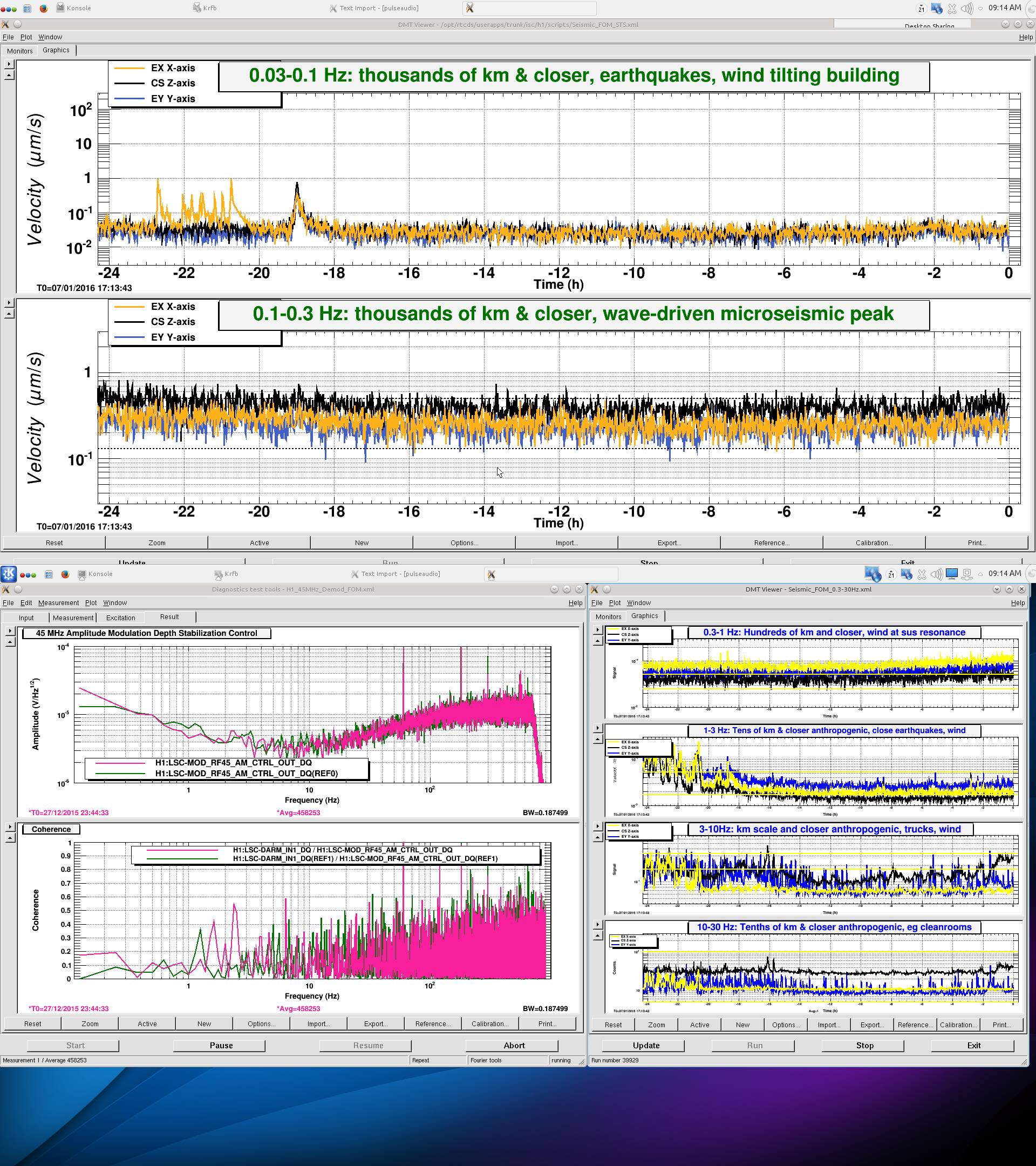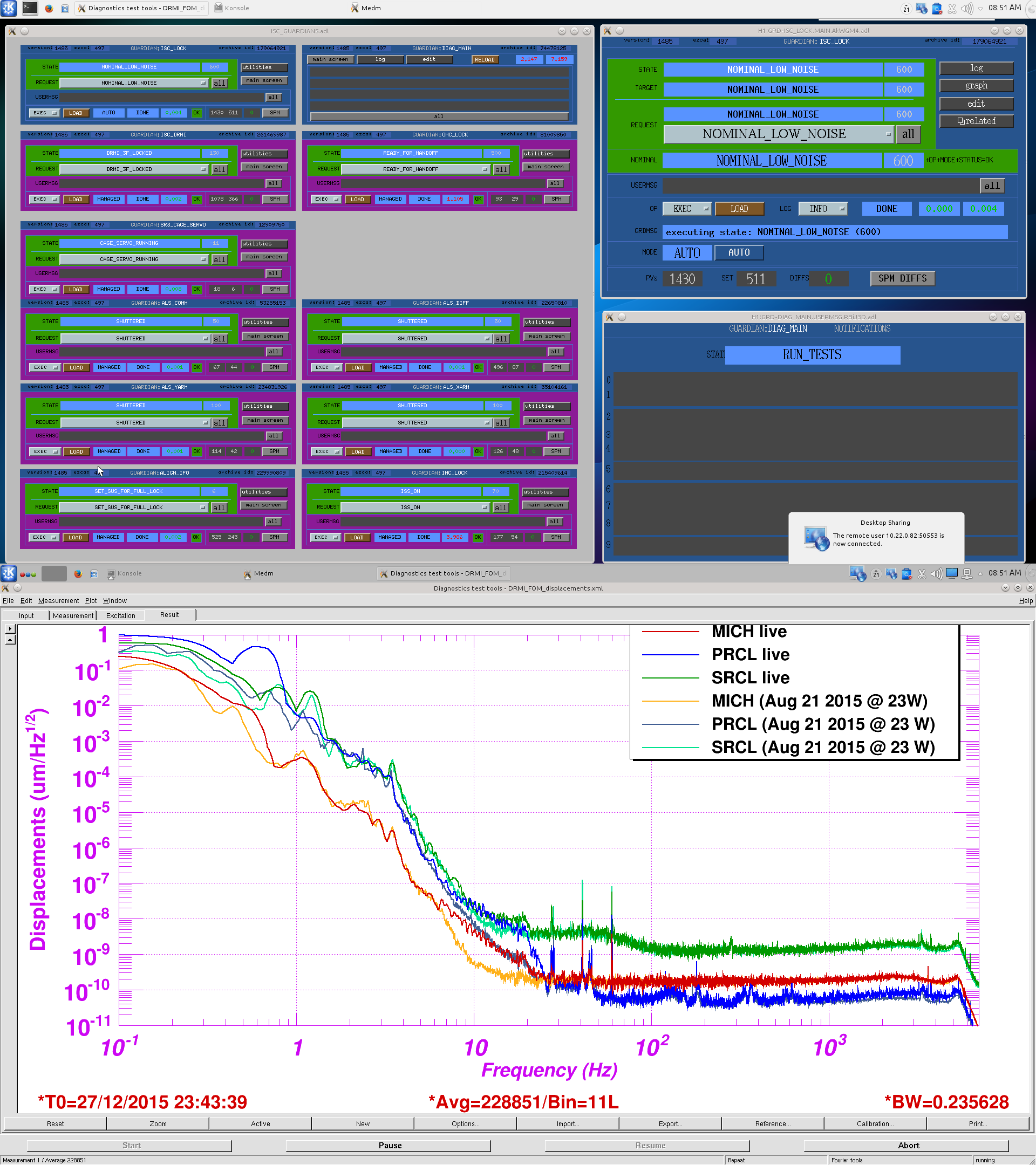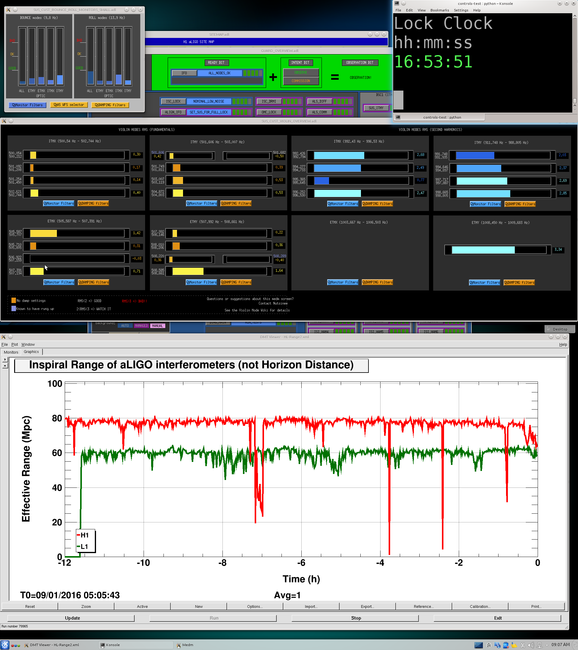 Mid-SHIFT SUMMARY: Well, 4 hours ago everything was looking rather ok. Then RF45 glitching started to pound on the range. Jeff K came in and, with the guidance of Rick S., we went out of Observing and turned off P-Cal X to “listen” for a few minutes. Then we changed the frequency of the lines, to no avail. We then changed the EOM RF45 offset around a bit and then set it back to nominal. For a short while, the noise settled away and we got our range back. ≈ 15 minutes ago, the noise has returned and our range has gone wacky again. More news at 4:00PM PST….