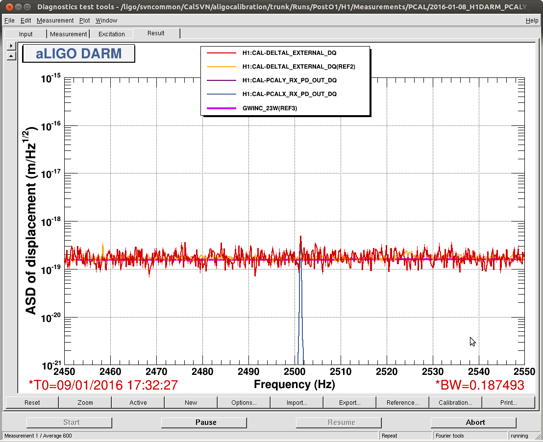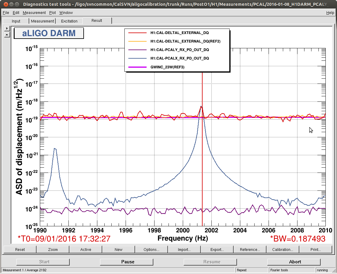 J. Kissel, R. Savage, E. Merilh While the IFO is screeching with RF45 noise, we've removed the intent bit and changed the 2501.3 [Hz] to 2001.3 [Hz]. In between, to exhonerate the PCALX from the excess noise and gltiching, we left all X-End lines OFF for 5 minutes between 18:26:10 and 18:30:15 UTC. No change in IFO noise characteristics -- still terrible. The new line is at amplitude 35000 [ct] in the PCAL X oscillator (H1:CAL-PCALX_PCALOSC1_OSC_SINGAIN), and has been on since 18:30:15 UTC (with ramp of 30 secs prior). Attached is the SDF screen shot before we accepted the new values.