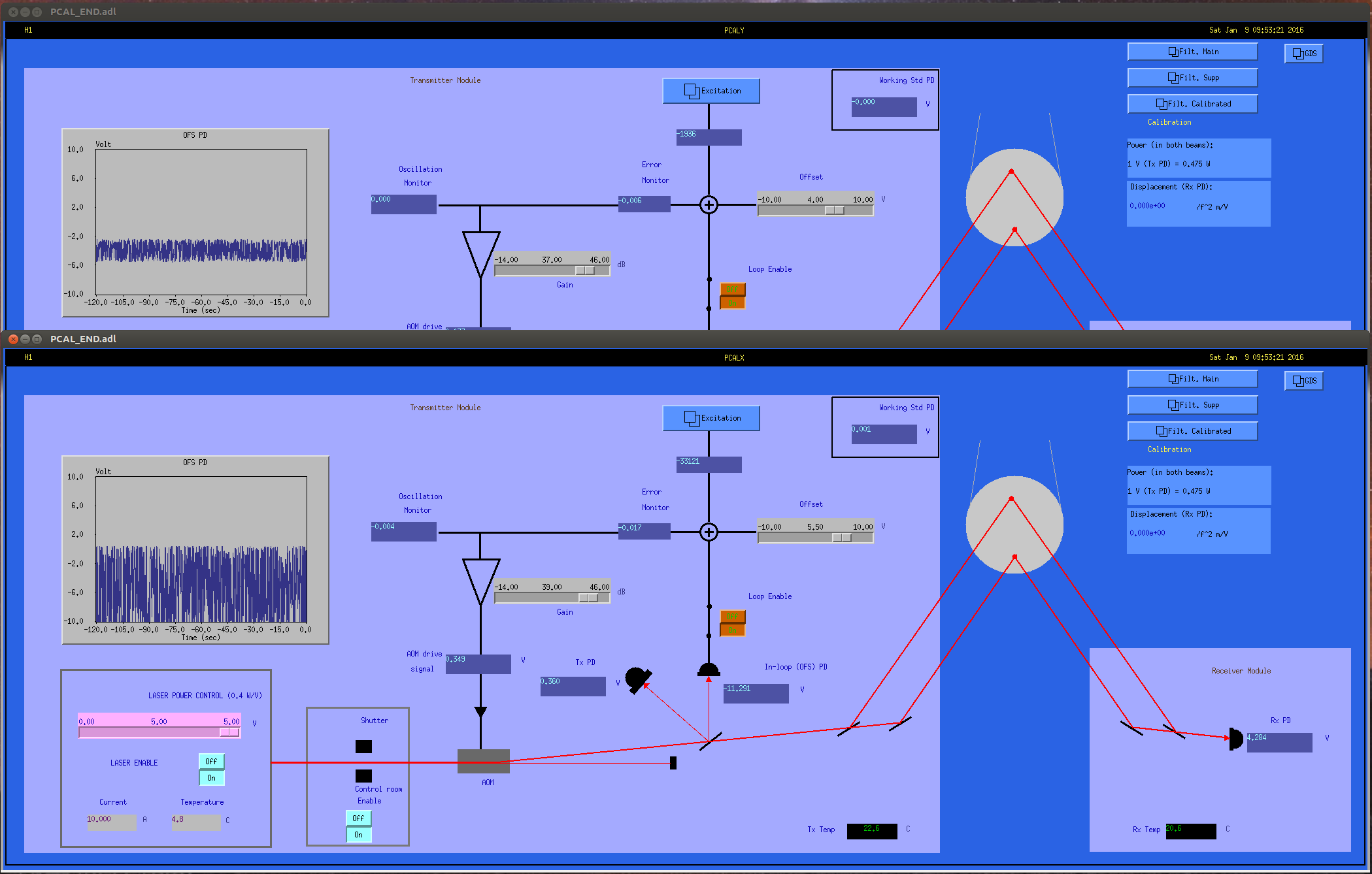 Amplitudes of voltages measured by RxPD and TxPD at 331.9 Hz (we have a Pcal calibration line at this frequency) at 12/01/2016 01:03:32 UTC are: