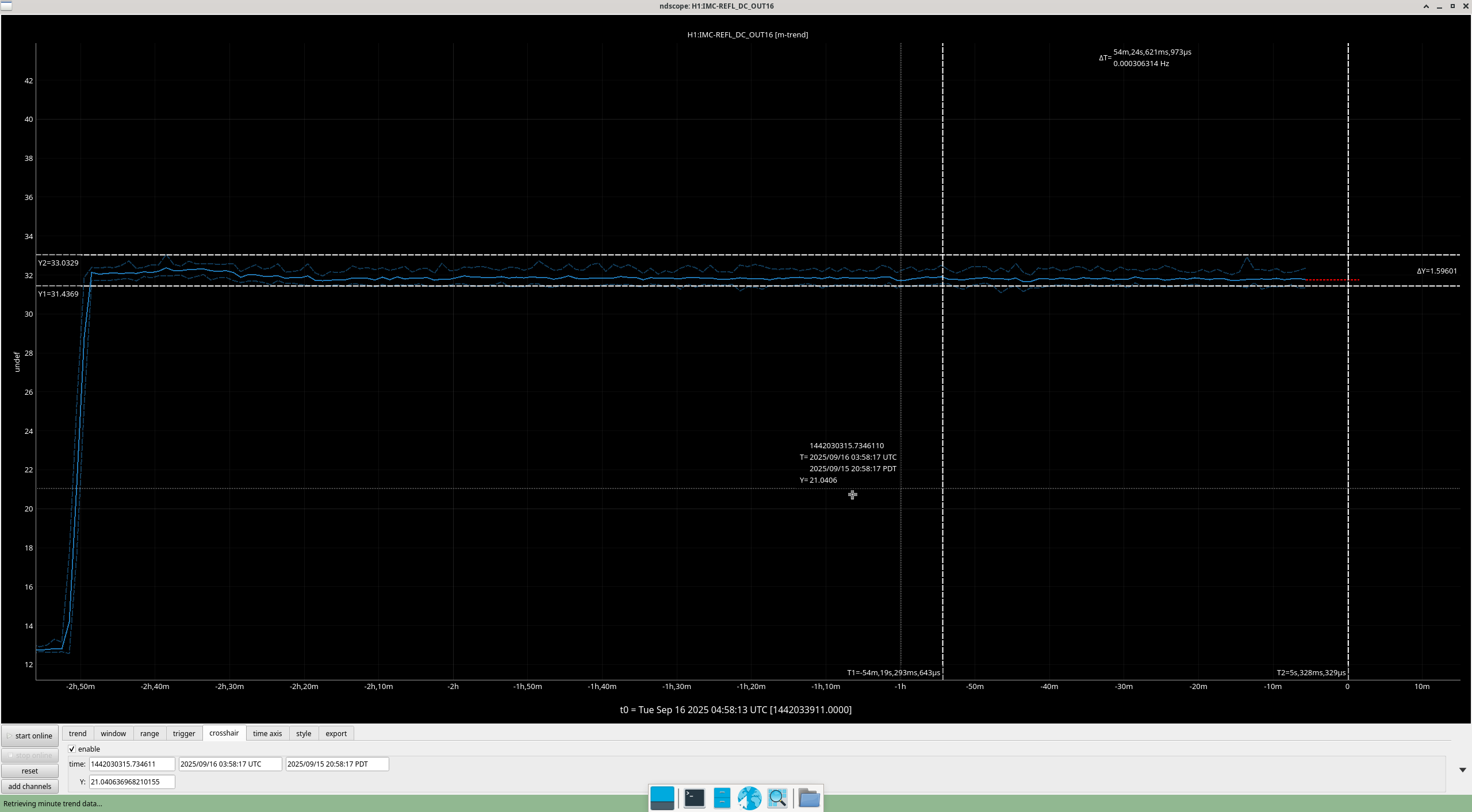 Now, I'm monitoring H1:IMC-REFL_DC_OUT16 and watching for an increase in power, which is bad. We've been at 63W (the new 60) for 18 minutes - here's a plot of that.
