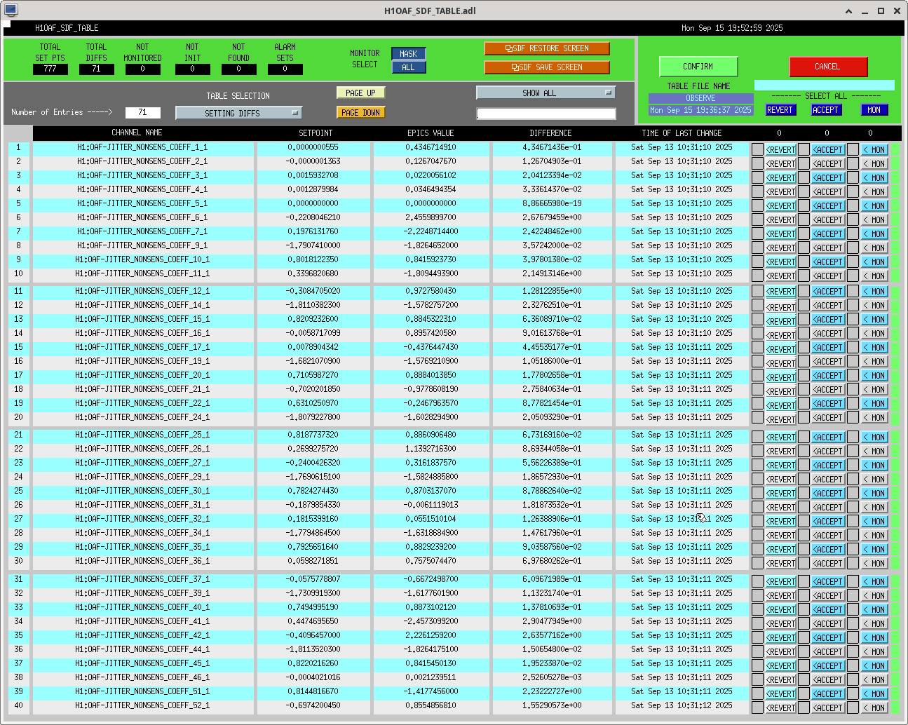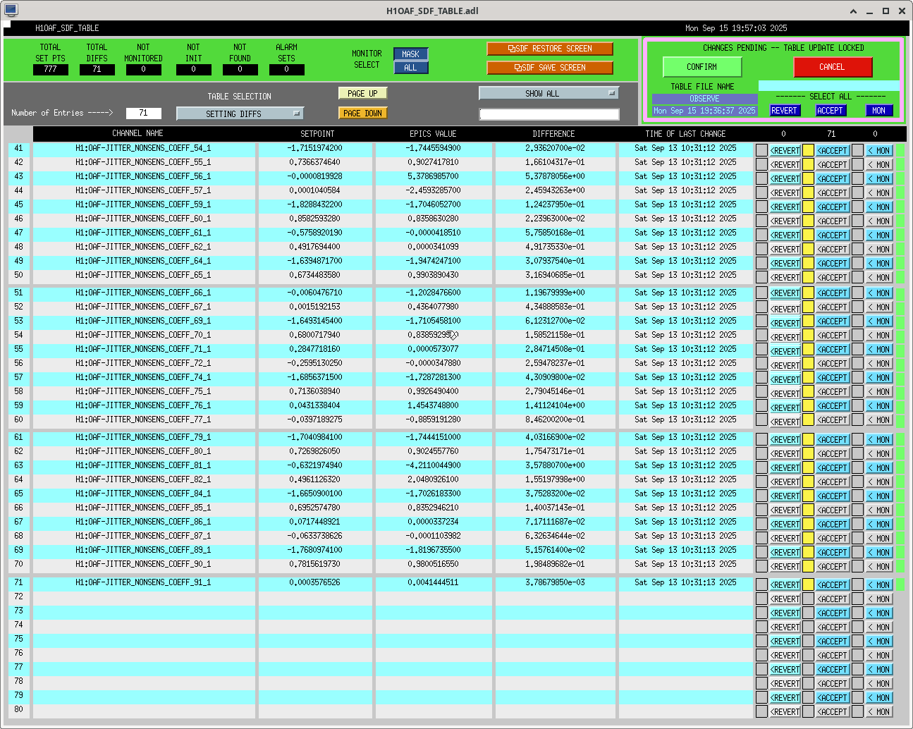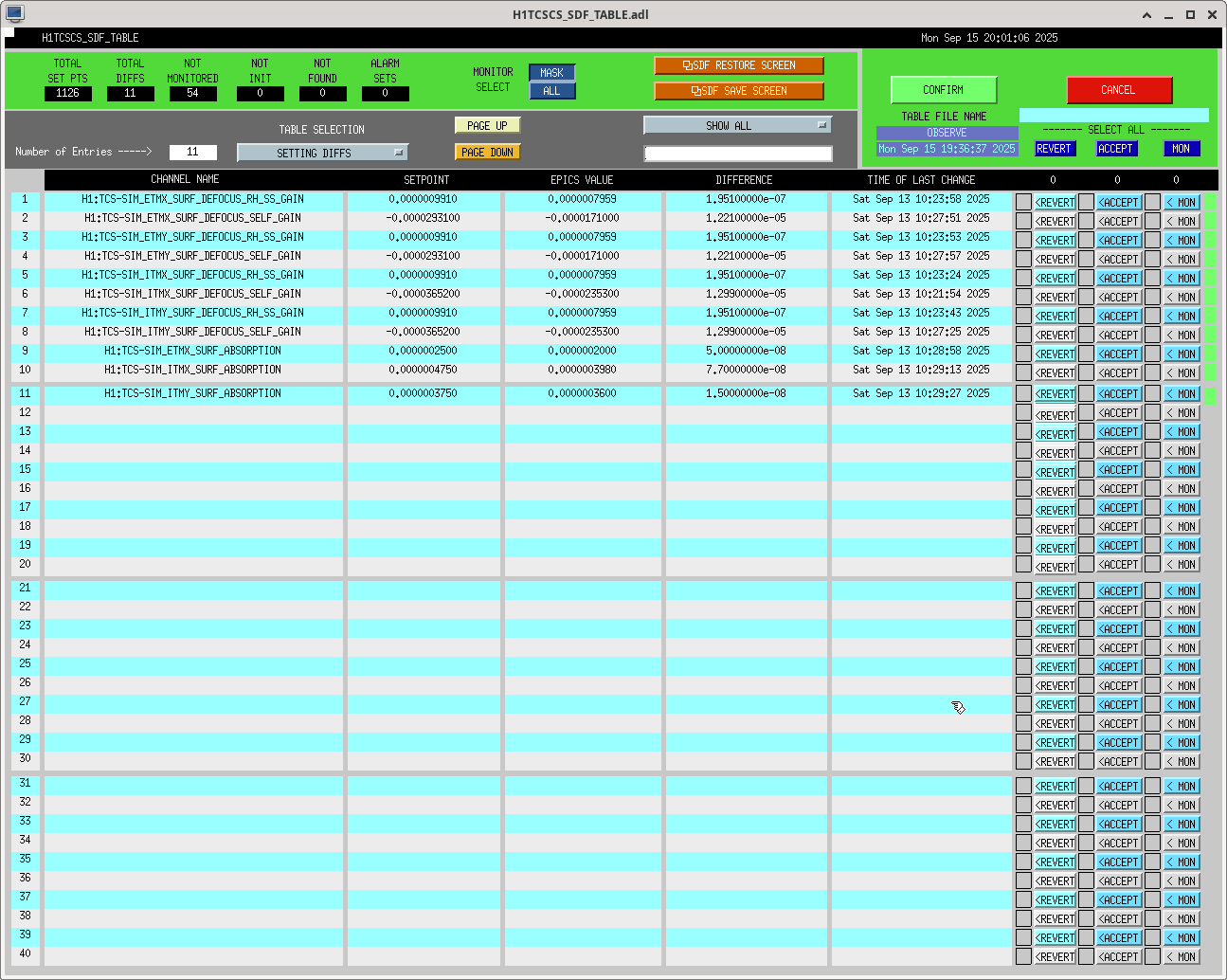 In this alog I accepted the TCS SIM and OAF jitter SDFs incorrectly. The safe restore had restored old values and I mixed up the "set point" and "epics value" columns here (a mistake I have made before and will likely make again). I should have reverted these values last week instead of accepting them.