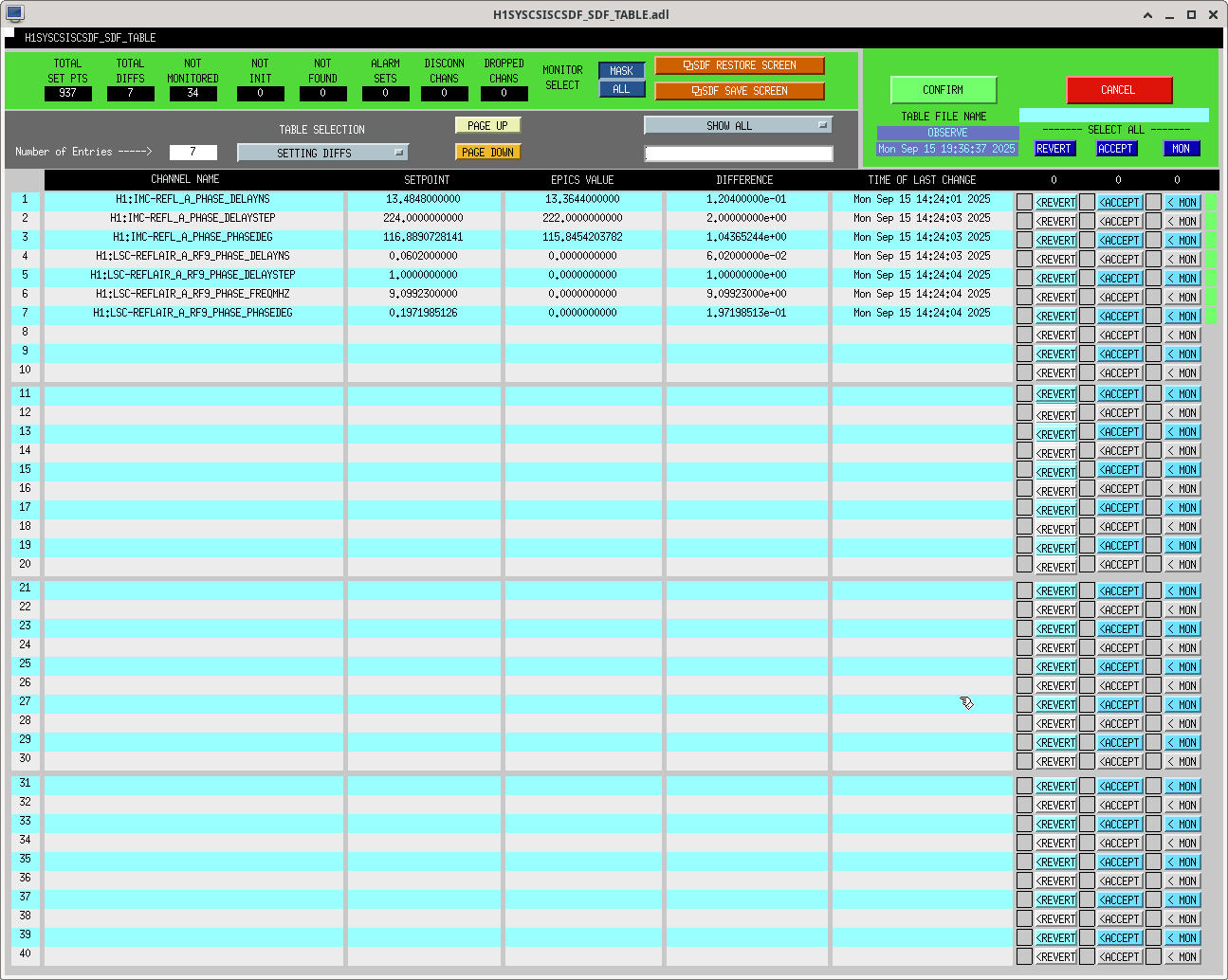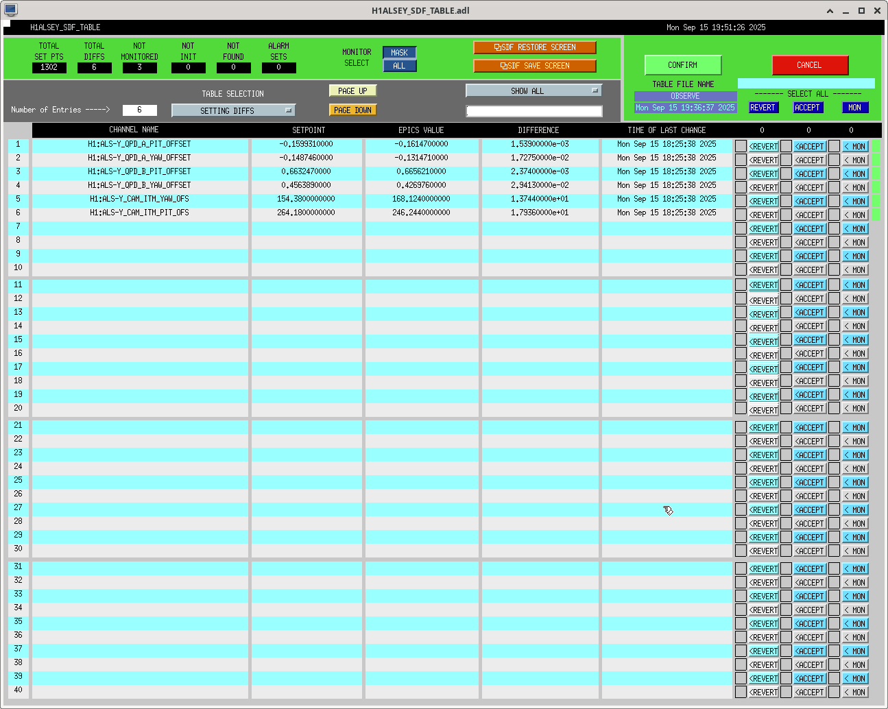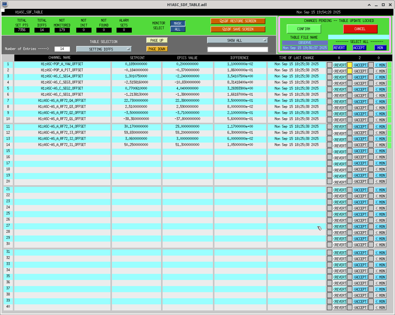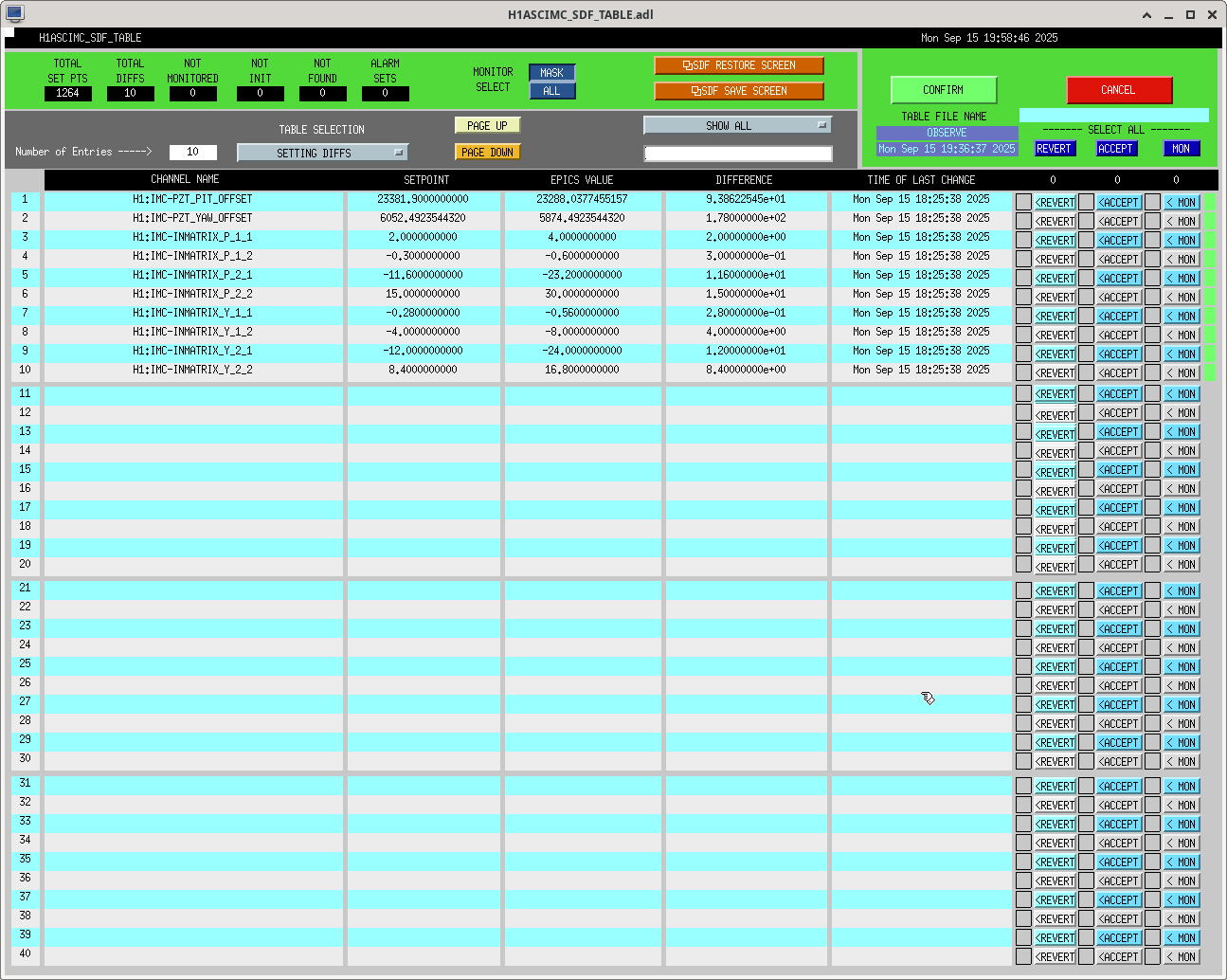 In this alog I accepted the TCS SIM and OAF jitter SDFs incorrectly. The safe restore had restored old values and I mixed up the "set point" and "epics value" columns here (a mistake I have made before and will likely make again). I should have reverted these values last week instead of accepting them.