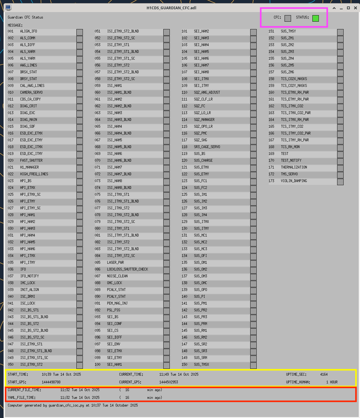 The CDS Overview MEDM has a "GRD CFC" button at the bottom showing the GRD-CFC status as GREEN/YELLOW. Pressing this button opens the H1CDS_GUARDIAN_CFC.adl MEDM (attached).