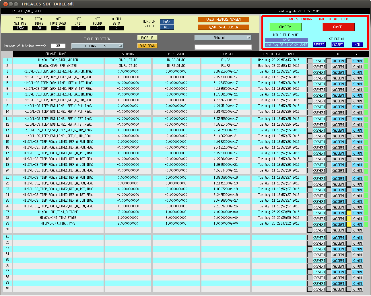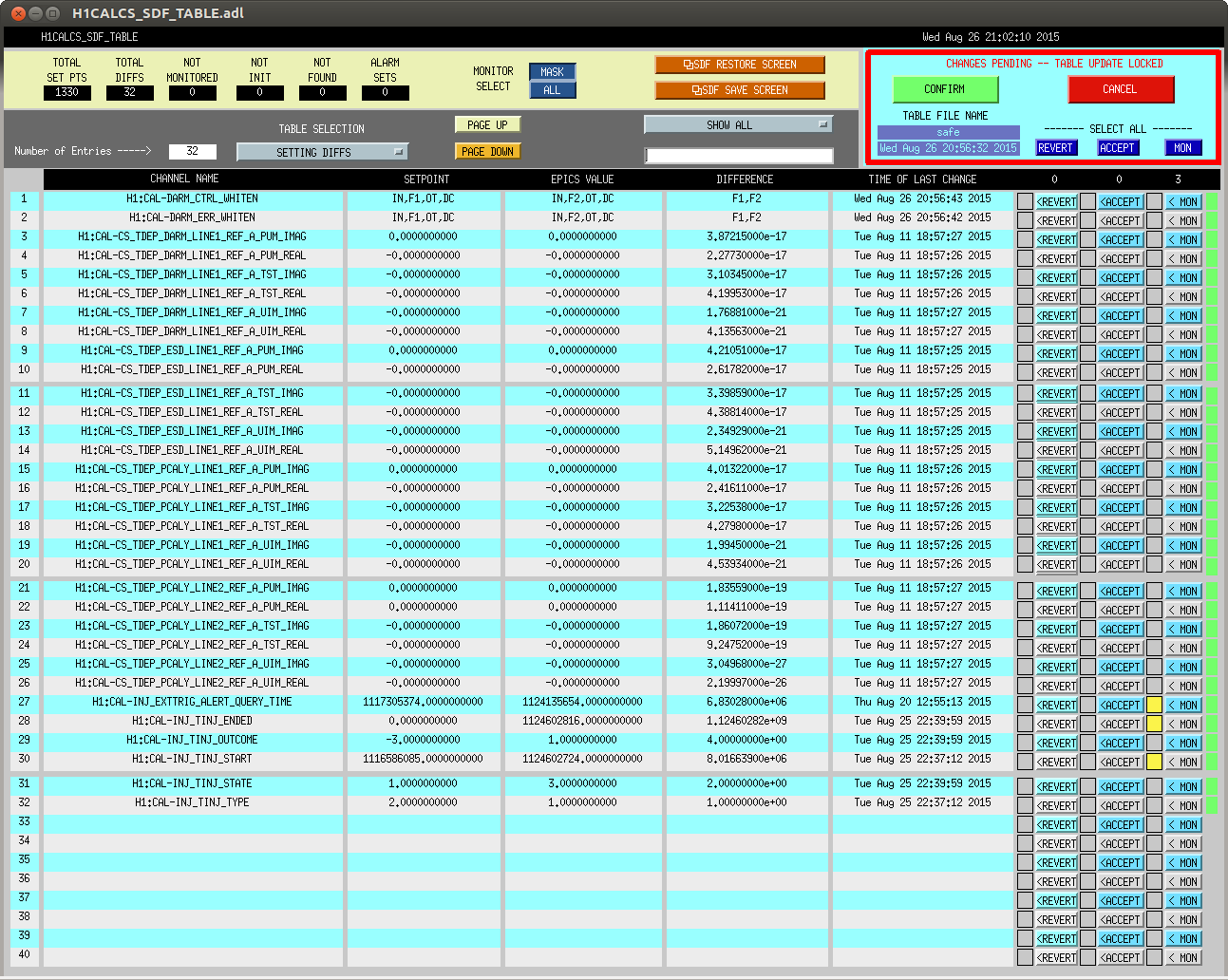 - Set the nominal ODC threshold values for all SUS, LSC, ASC, TCS and OMC during the morning lock. - Updated SDF with those settings. - Note that TCS got disconnected yesterday, so ODC_MASTER settings related to TCS are not SDF'ed yet. - Updated all ODC screens to show all relevant bits. - Added the intent bit button to the ODC master screen (it is also available on the Guardian screen). With that almost all indicator are green in full lock. The exceptions are: - ADC saturation: - Unfortunately many models have an ADC channel that by design saturates, i.e. the CDS bit delivered to ODC for those models is always lo. - On top of that some models (like e.g. ASC) report a saturation, even though n channel seems to be saturation. Dave Barker has noticed that before... - DAC saturation: TCS currently reports a DAC saturation - not sure why. - LSC and ASC report a incorrect parity bit (that's an ODC internal issue)