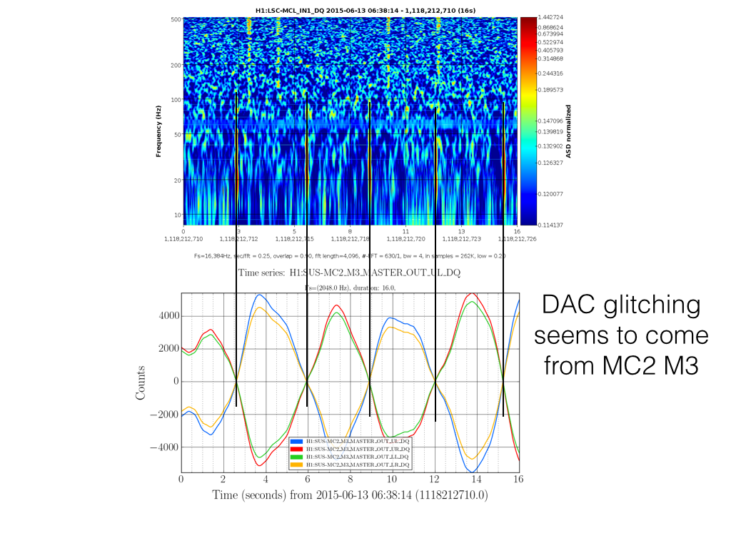 DAC glitches were noticed in LSC-MCL_IN1, these seem to come from SUS-MC2_M3 as shown by the lineup plot :