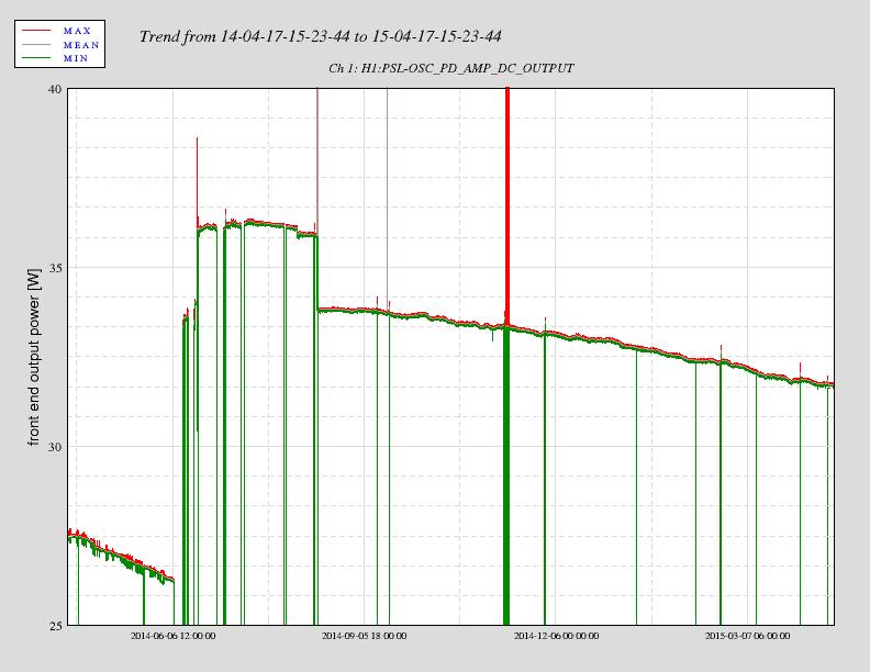 Attached is the plot for the front end laser output power for the past year. The change around June 6th 2014 coincides with when the diode box was switched. Not sure what the change around mid-August 2014 was caused by. We should check the power monitoring photodiode alignment and compare its output to a power meter.