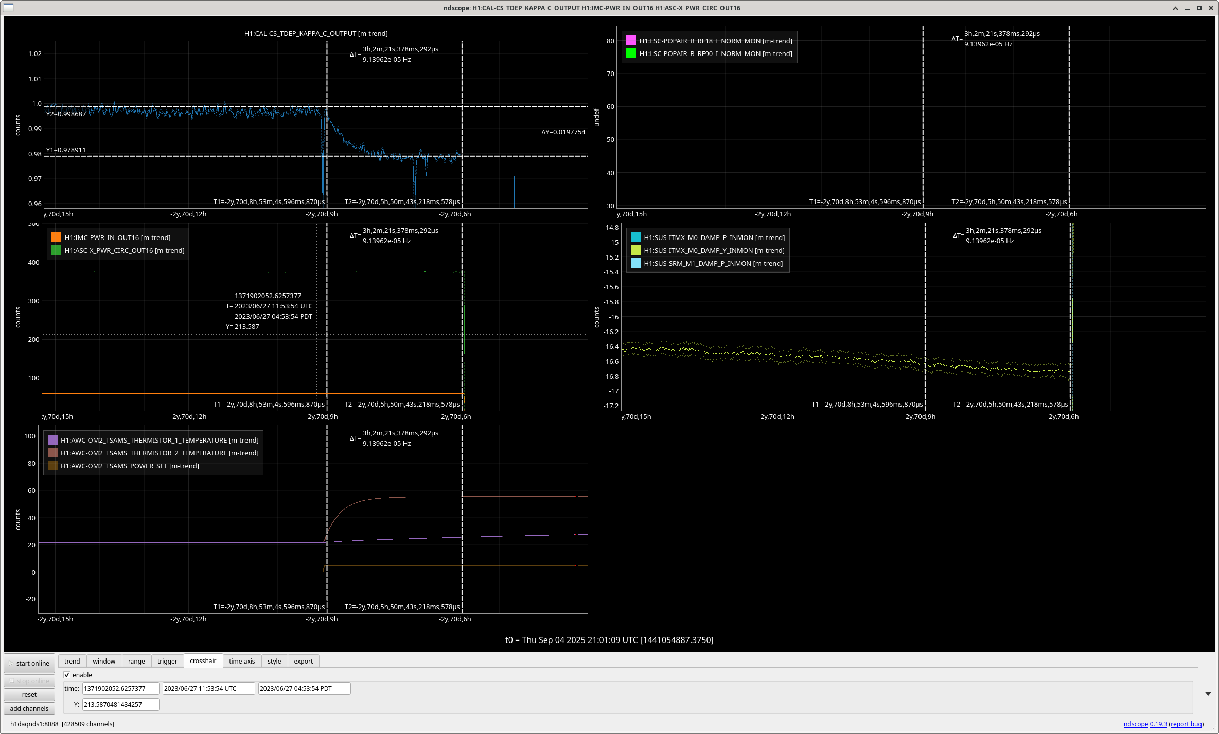 It's also important to note that the calibration has likely changed with the hot OM2. Some of that can be corrected with the TDCFs. However, we saw that the required SRCL offset to minimize SRC detuning with OM2 hot was significantly different, alog 86737. This means that the sensing function is probably significantly different, causing some change in the calibration that is not compensated. We didn't take any calibration measurements with hot OM2, so we have no idea how much or how to compensate the calibration change.