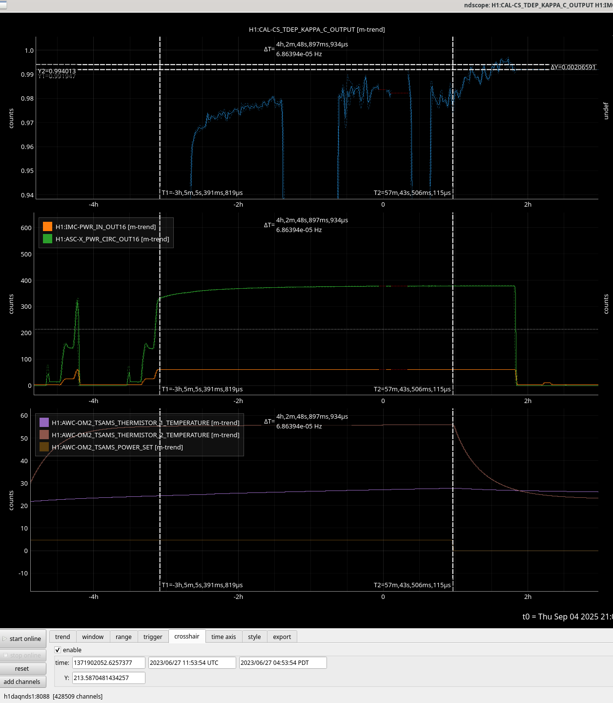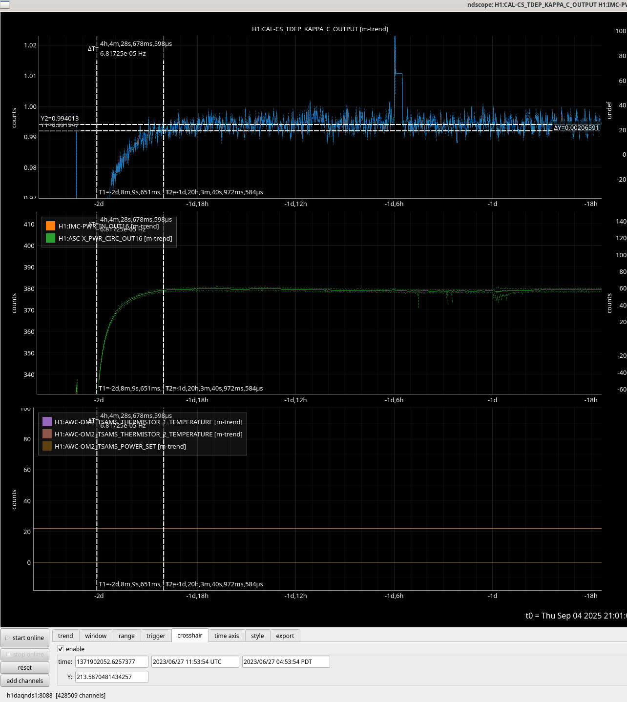 The optical gain in this thermalization seemed to be fairly similar to the previous lock where OM2 was cold in the first hour. The change in optical gain between OM2 hot and cold was much smaller this time around, so we needed to see the full thermalization in order to see what the gain change was. We set the OM2 heater off 4 hours and 5 minutes after the power up, the attached screenshot shows a trend of optical gain during the previous thermalization while OM2 was cold, with a vertical cursor 4 hours 5 minutes into the lock. The horizontal cursors show where the optical gain was at 4 hours and once the thermalization was complete, the optical gain continued to increase by 0.2% after the first 4 hours. The next screenshot shows vertical cursors also at the time of power up and 4 hours later, and the horizontal cursors are the same as on the previous screenshot (OM2 cold). It seems that the optical gain was about 1.1% lower with OM2 hot than cold, although fitting these two thermalizations to an exponential might bring them closer by as much as 0.2%. Our current ring heater settings are 0W on ITMY, 1.5 W/segment on ETMY and 0.44W/segment on ITMX and 1W/segment on ETMX.