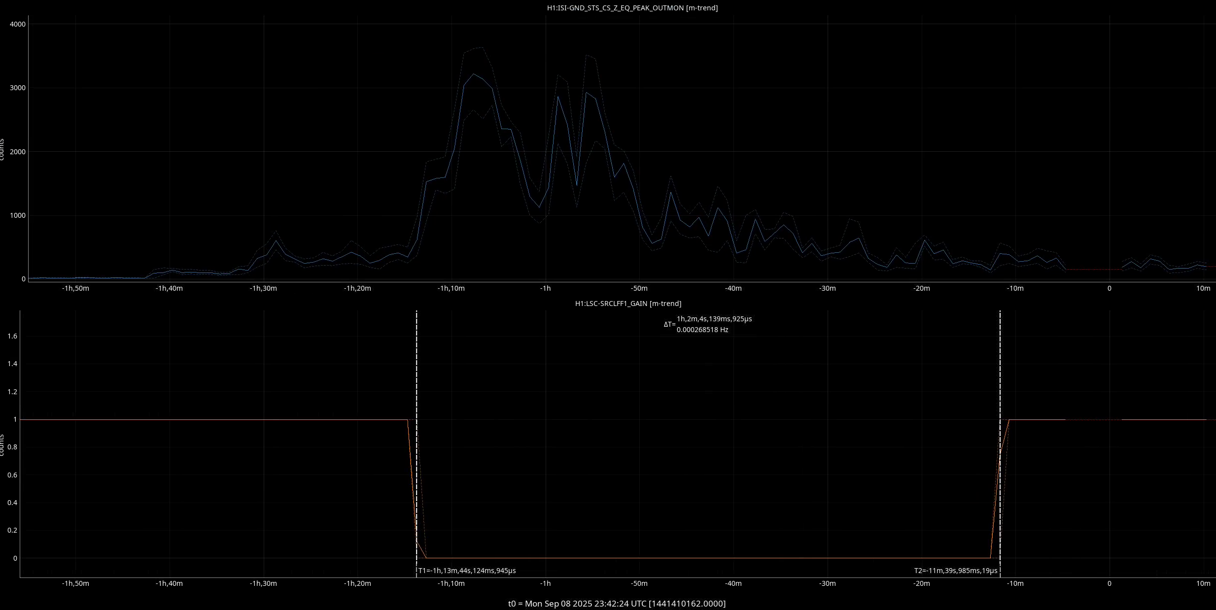 This afternoon a 6.4 mag eq in Fiji provided another good opportunity to test the high asc gain eq mode. This time peak velocities were about 3.6 micron/s on peakmon, around 2 micron/s on the .03-.1hz blrms on the wall fom. We were out of observe for ~1hr, but we probably would have been down for at least 2hrs without the transition. Definitely one of the largest eqs we've ridden out, ever.