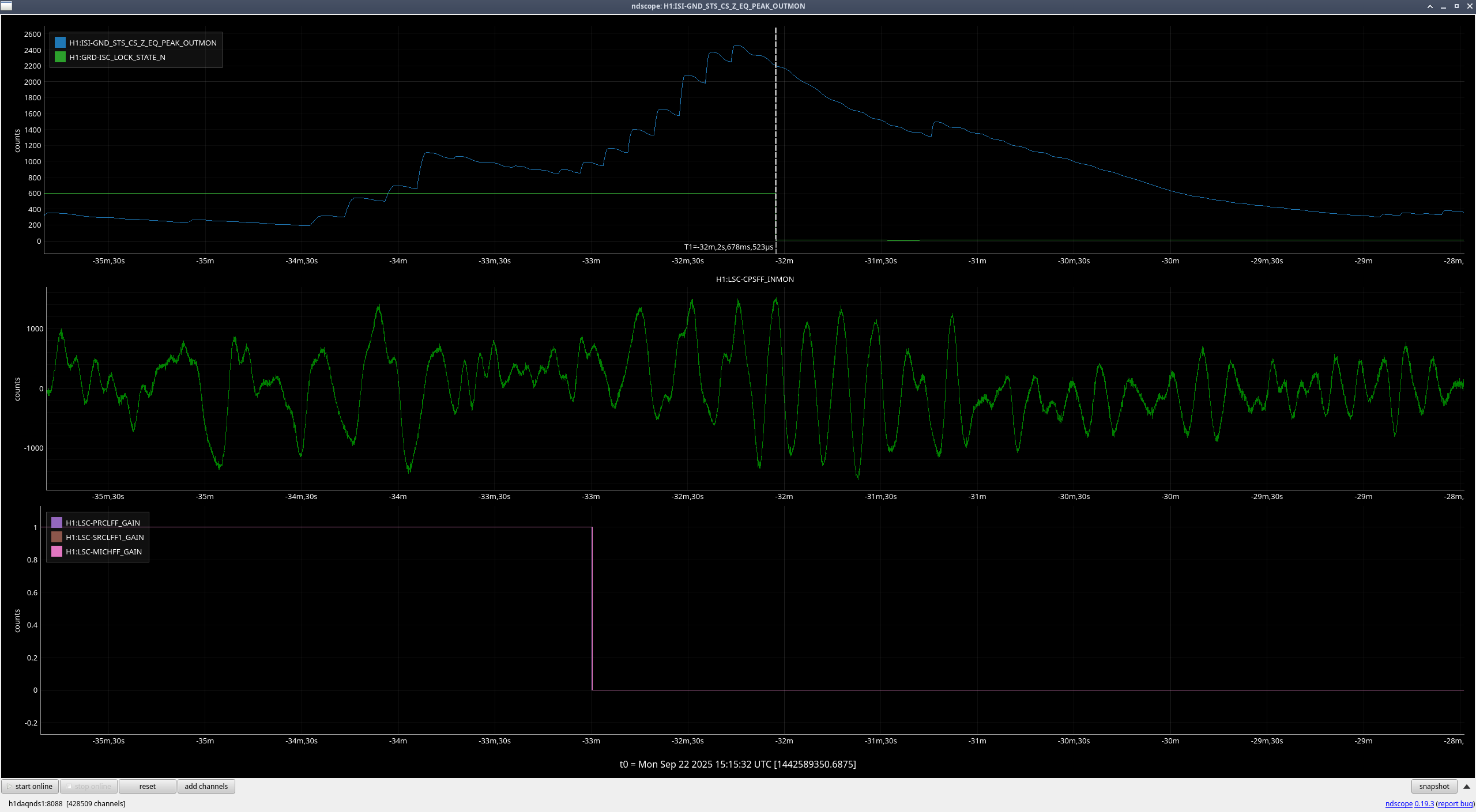 14:41 Out of Observing and ASC Hi Gains turned on for earthquake