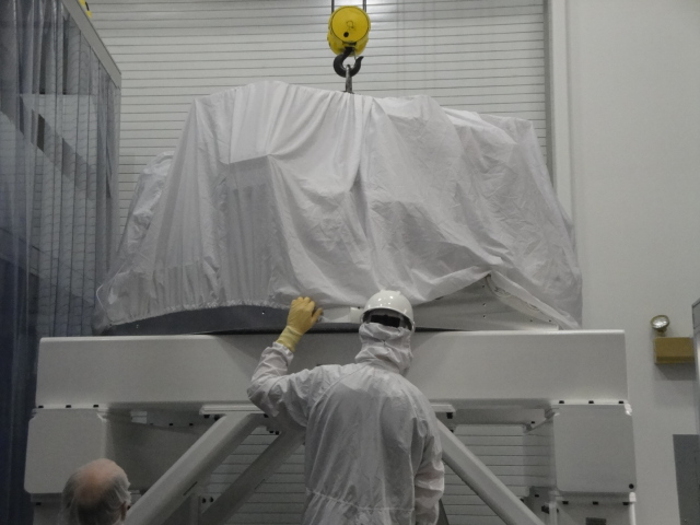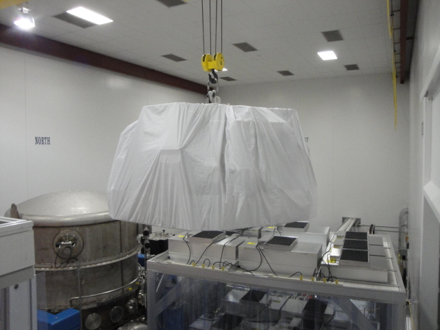 The Test Stand and the Cleanroom was clean this morning--Thanks Terry & Christina We then promptly moved the clean room exposing the Test Stand (MTS) to receive the ISI. A few photos here will help: 1-The MTS is readied 2-Here it comes over the Cleanroom 3-Reverse Thrusters on 4-Touchdown The lifting gear was then unbolted and stored. Finally, the cleanroom was returned to the MTS and we secured the ISI to the Stand. Thanks Jim, Scott & Randy