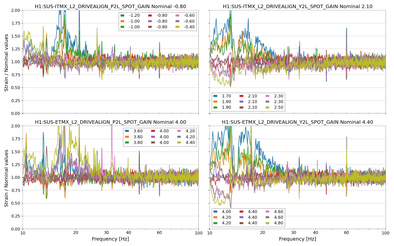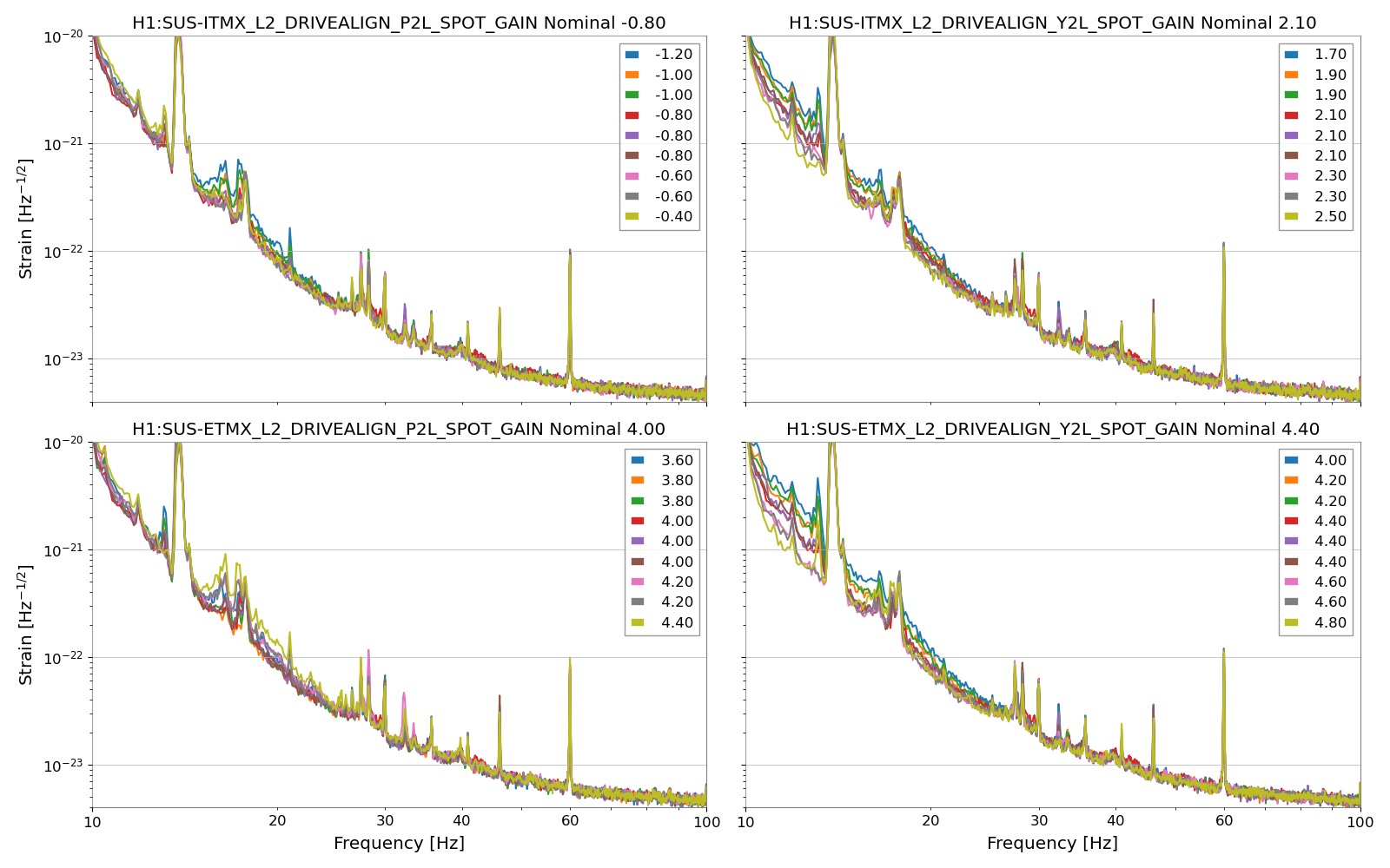 The first plot shows the strain spectrum (GDS-CALIB_STRAIN_CLEAN) for 900 seconds for each available step of P2L and Y2L for the x arm. Some steps were repeated twice. In each panel, the title shows what A2L gain is being changed, and what's the nominal value. The second plot shows the ration of strain spectrum for a given A2L gain over the averaged strain spectrum with the nominal A2L value. So lower than one means the A2L value is improving the sensitivity.