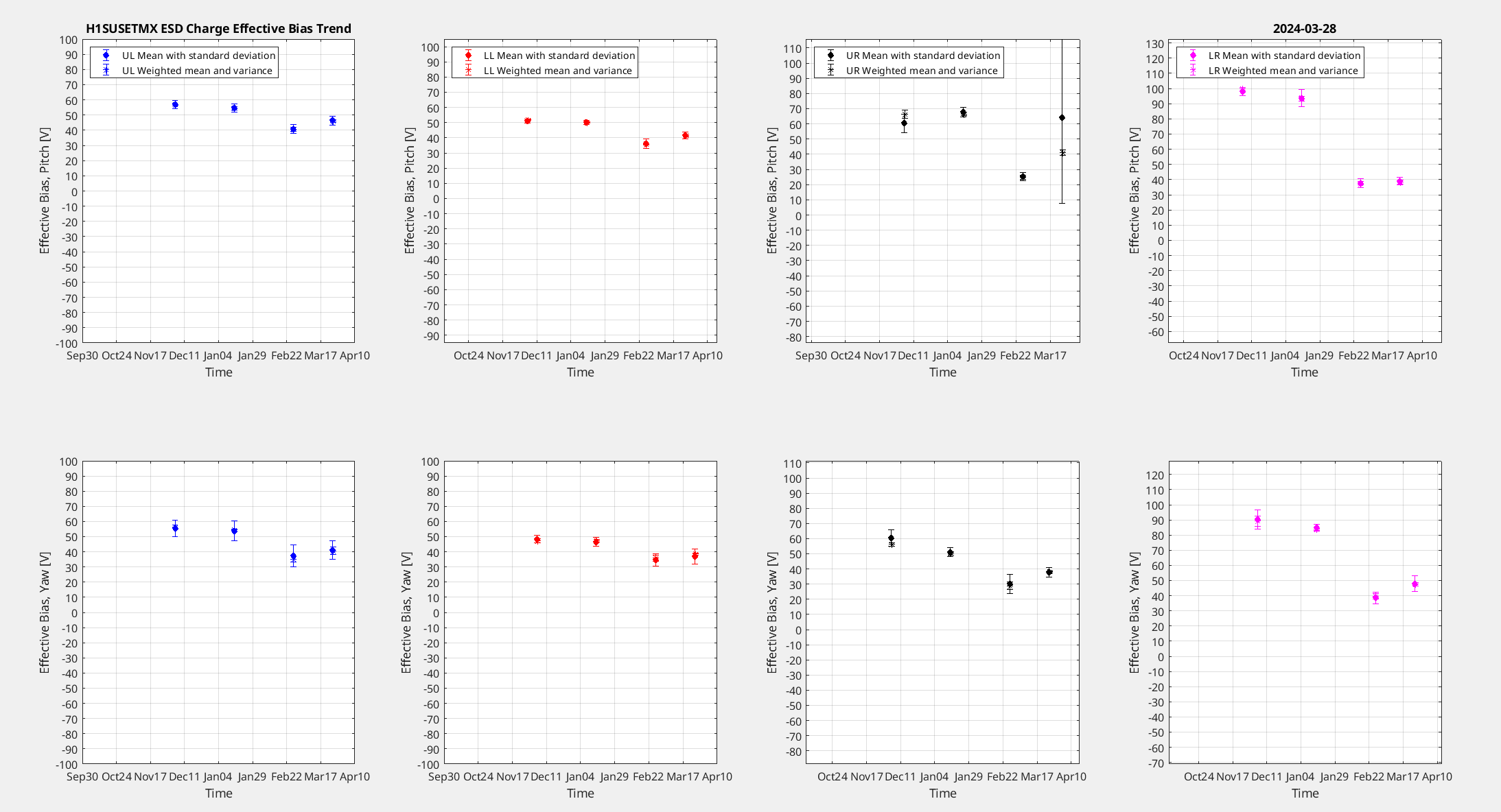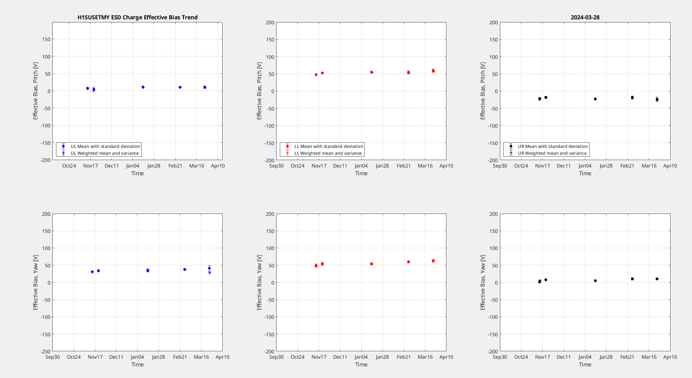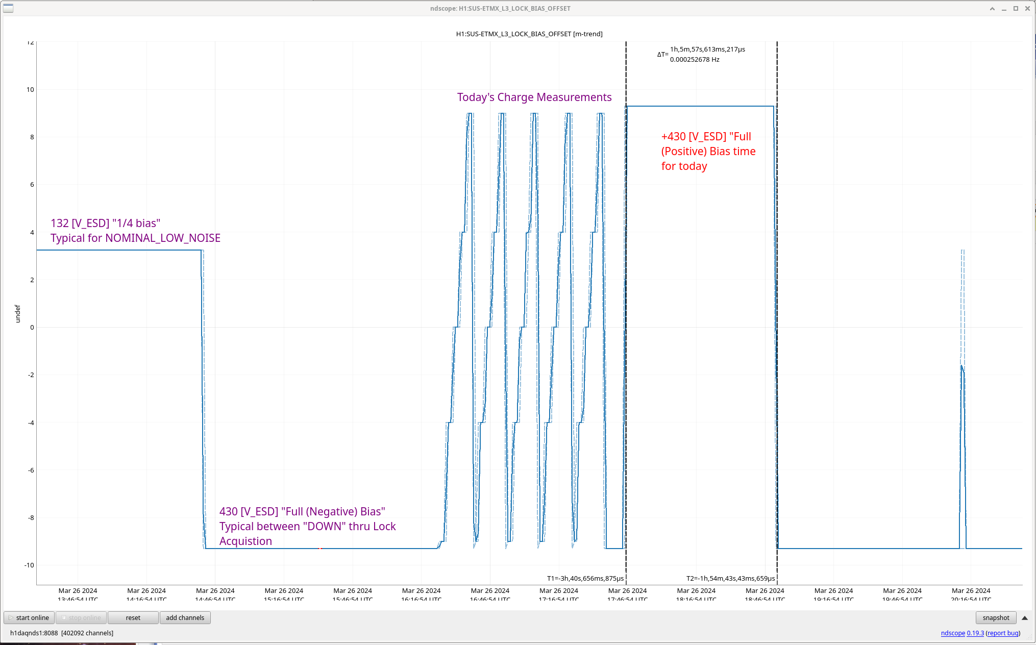 H1 SUS ETMX L3 ESD Bias was held at +430 [V_ESD] in order to mitigate the charge build up identified in LHO:76326 for ~1 hr today, 2024-03-26, between 17:46 and 18:46 UTC. Attached is a trend of the ESD bias offset (calibrated in [V_DAC] rather that [V_ESD]) throughout today's maintenance.