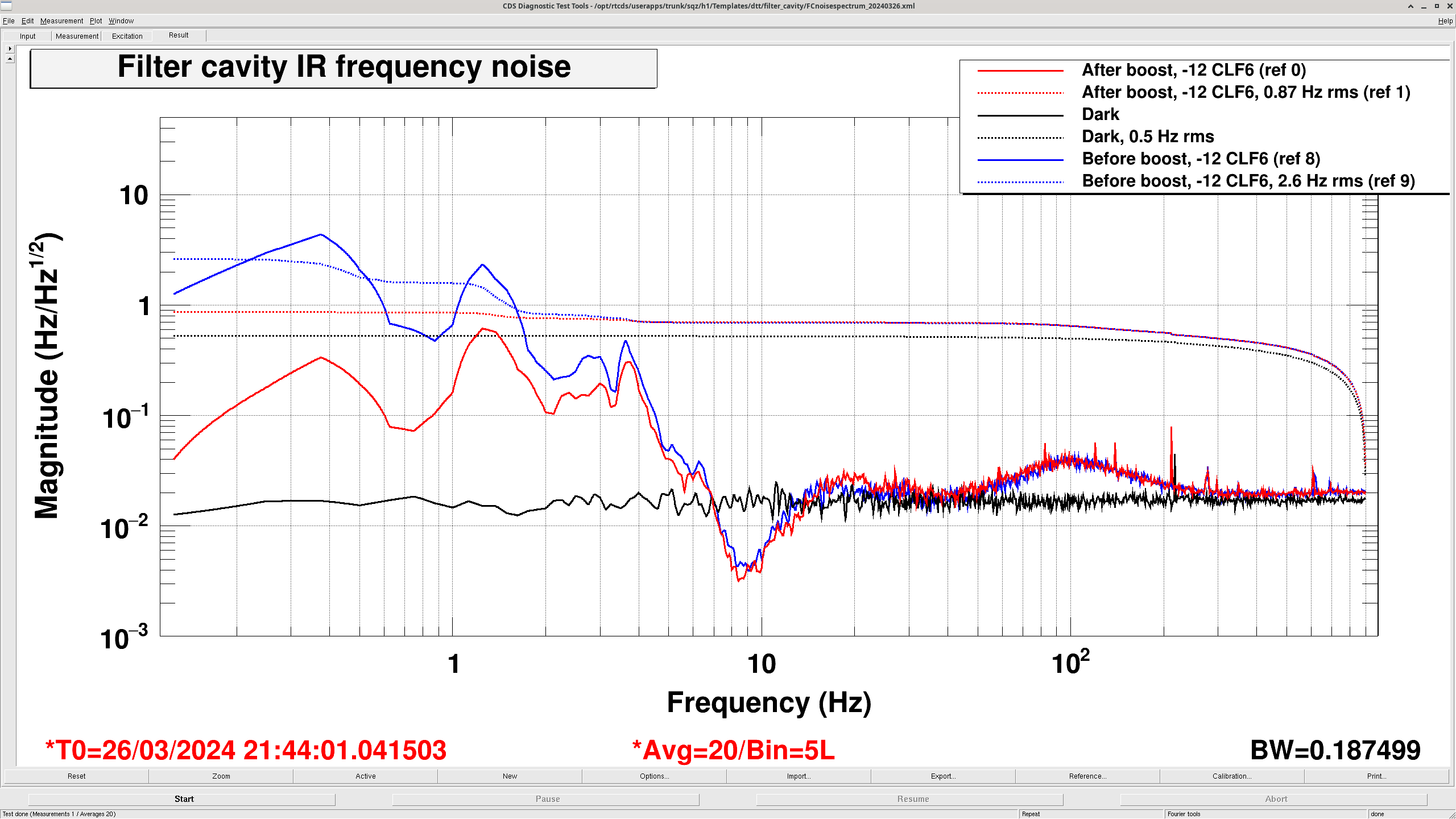 Since we see the 0.4 Hz motion in FC IR error signal, we added a boost filter for FC IR. The new boost filter is p0.1z5 and it is in FM9 of FC_LSC_DOF2. The first attachment shows the improvement of FC IR error signal with the boost filter. The rms is reduced by a factor of 3. We modified the SQZ_FC guardian to add this filter as follows.