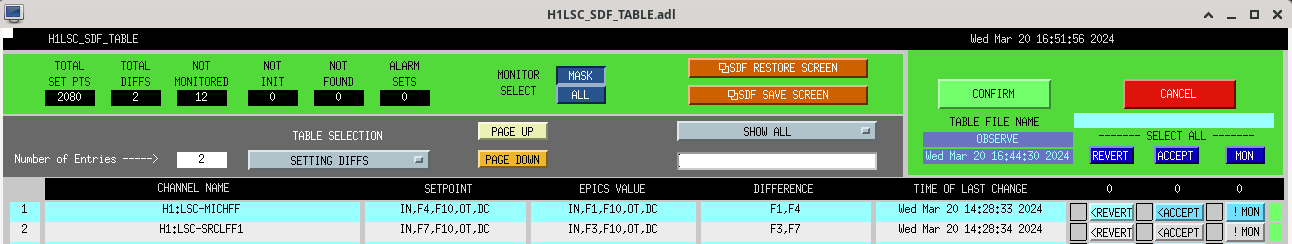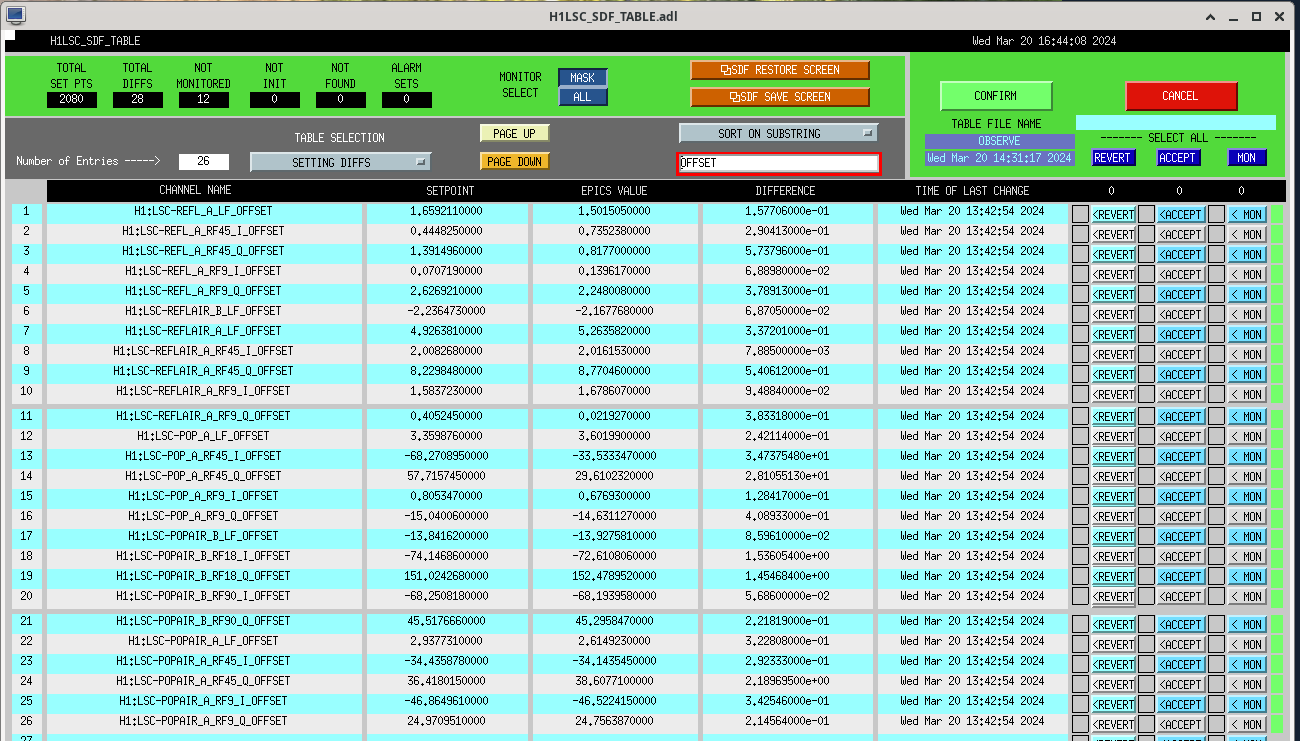- We lost hours tracking down why the filter cavity failed to lock on green. A reminder to check SDF next time we run into mysterious problems.