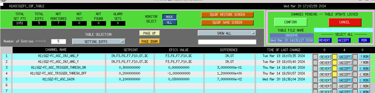 - Naoki measured the SQZ IFO sensing matrix. We found a big cross coupling between ZM5 P to AS42 B Y. Other than then everything else was sensible. A new improved sensing matrix has been implemented.