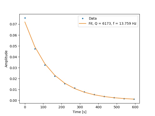 I extracted the data during the ringdown time, after the filter that was driving the mode was turned off. I split the data up into smaller segments and estimated the height of the peak in the ASD and fit a decaying exponential. The estimated Q of this mode is about 6173 with an estimated frequency of 13.759 Hz. The resulting plot of the exponential fit is show in the third attachment. I performed the fit by taking the logarithm of the data and fitting a linear regression- the resulting r-squared value was 0.998, so I think this is a very good fit. However, I made no estimate of the background for this fit, so there may be some bias in the fit itself. I tried to perform a more precise fit of the damped sinusoid using a digital heterodyne, but I'm unhappy with my curve fitting algorithm. I think ultimately that may be a better way to get a more accurate Q (but if I'm being honest I am unlikely to follow through on that work unless someone really wants me to).
