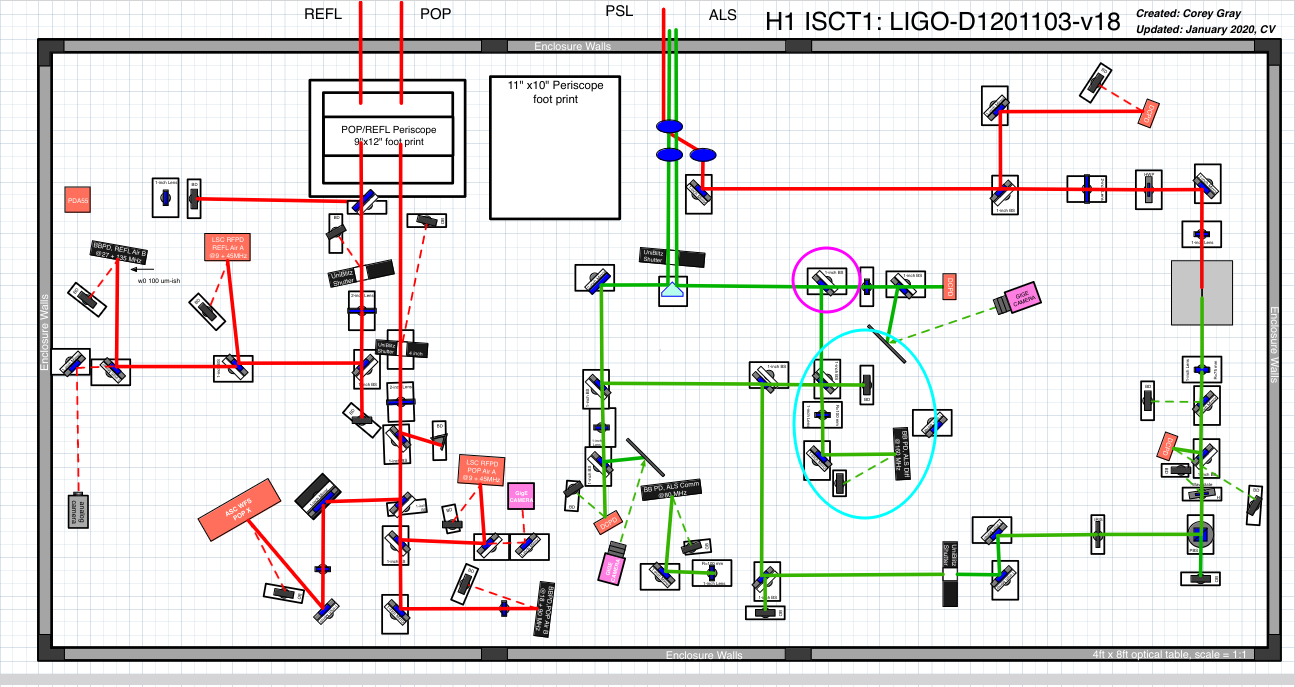 Before going on table I ran a green initial alignment, input align, and mich bright. The BS circled in pink on the layout attached was translated to reduce the clipping on that optic. The downstream BSs within the light blue circle then needed to be adjusted to maximize the diff beatnote.