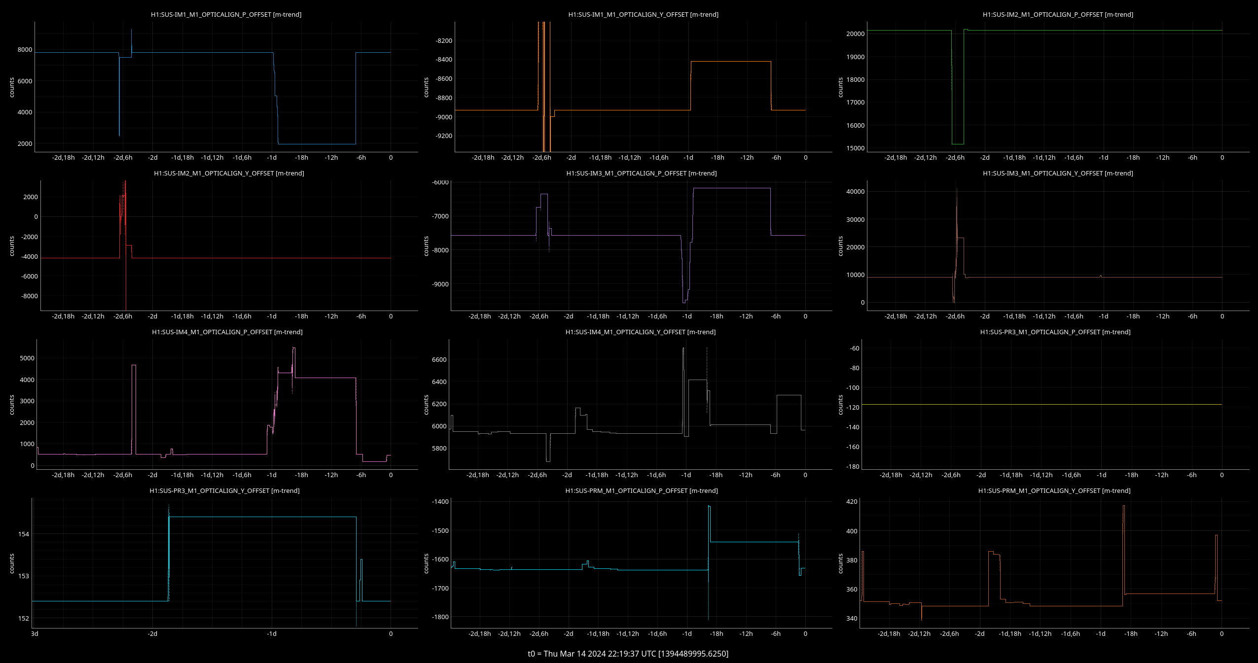D. Barker, J. Kissel, O. Patane, R. Short ECR E1700387 IIET Ticket 9392 WP 11743 This aLOG that summarizes all the details of the work that went in to upgrading the SUS ETM and SUS TMS watchdog systems this past Tuesday, Mar 12 2024. Front-end model and MEDM screen infrastructure changes: LHO:76269 To receive these upgrades, - svn up the following common directories, ${userapps}/release/sus/common/models/ ${userapps}/release/sus/common/medm/quad/ - svn up the following h1 specific directories and copy what top-level changes that are shown in the above linked aLOG, ${userapps}/release/sus/h1/models/ ${userapps}/release/sus/h1/filterfiles/ Dave's summary of the install, and corresponding issues: LHO:76304 Filling out the foton and EPICs infrastructure to get the new WD system functional: LHO:76352 To receive these upgrades, - svn up the following h1 specific directories and copy what filters you see in the OSEMAC_BANDLIM and OSEMAC_RMSLP filter banks ${userapps}/release/sus/h1/filterfiles/ or use the design strings described in LHO:76352. A review of the calibrated BLRMS output vs. thresholds: For ETMs LHO:76343 for TMTS LHO:76347 - Note, 25 [um_RMS] is still an arbitrary threshold. We've already found that it might behoove us to increase the ETM L2 threshold to 30 [um_RMS], but for many other stages, something lower might suffice. Only time and data will tell. Surrounding python code underneath MEDM infrastructure: LHO:76389. To receive these upgrades (when we've reconciled the issues discussed in this LHO:76389 aLOG) - svn up the following common directory, ${userapps}/release/sus/common/scripts/ Proposed Schedule of the continued roll-out: Next week (Mar 19 2024), we hope to upgrade the ITMs and the BS. The following week (Mar 26 2024), we hope to upgrade the HSTS and HLTS. The following week (Apr 02 2024), we hope to upgrade the OMCS, HTTS, and HAUX The following week (Apr 09 2024), we hope to go through the already new WDs and calibrate their RMS signals, and update the thresholds, like we'll have done for the above "older" suspensions along the way.