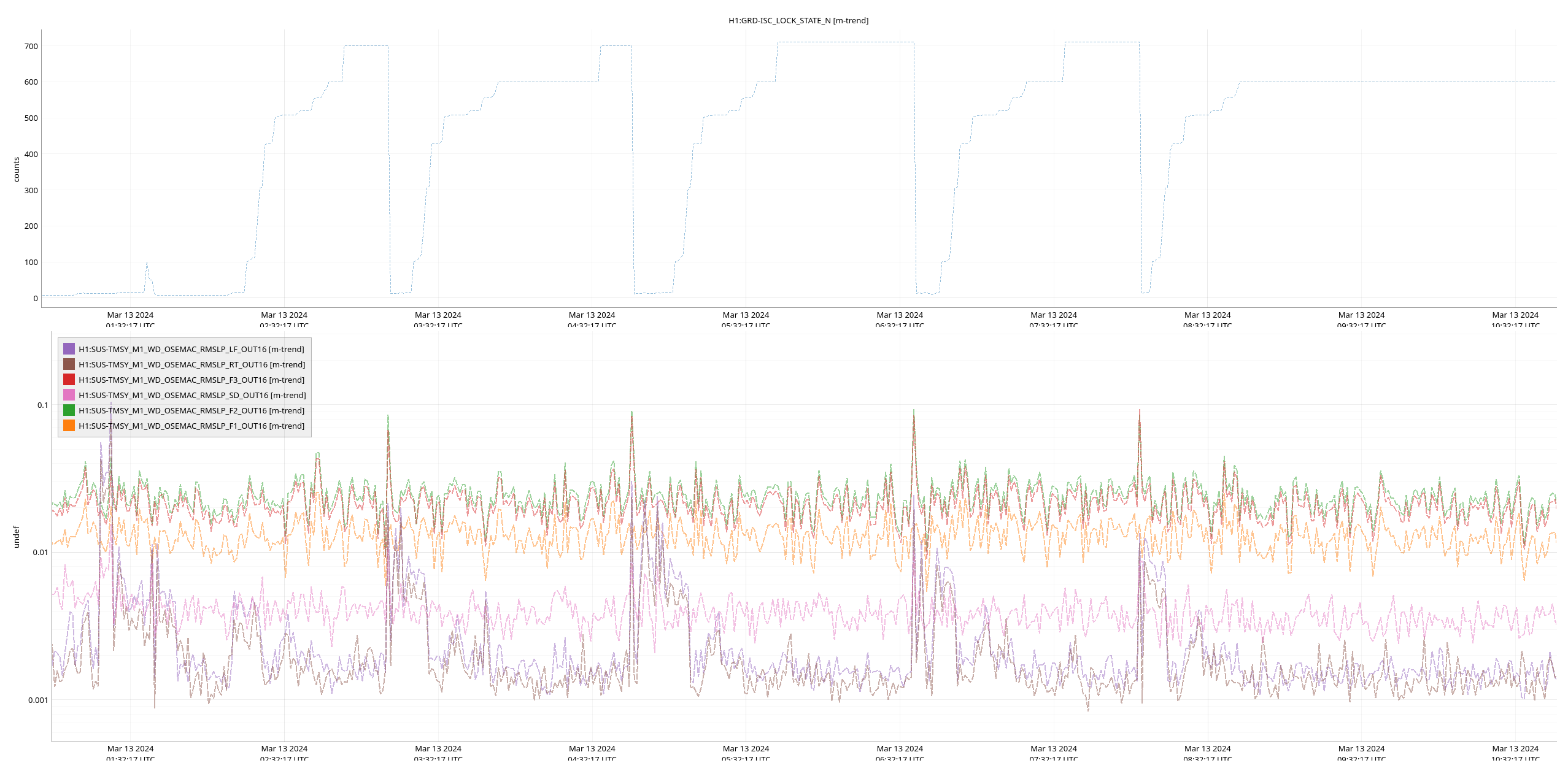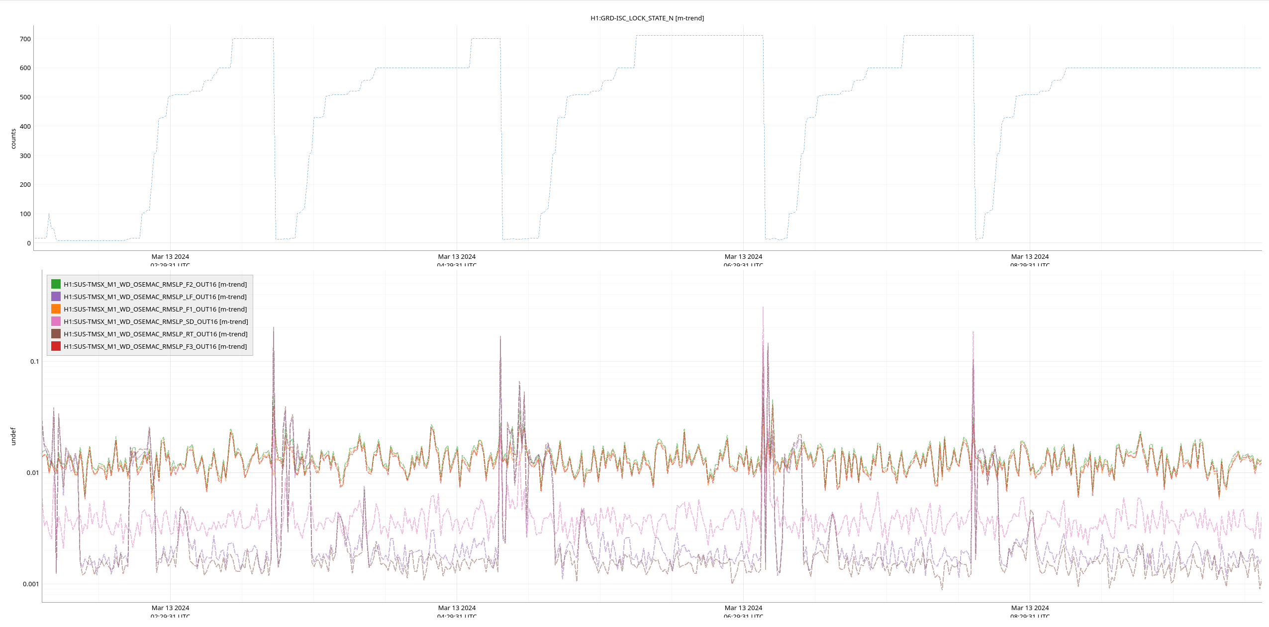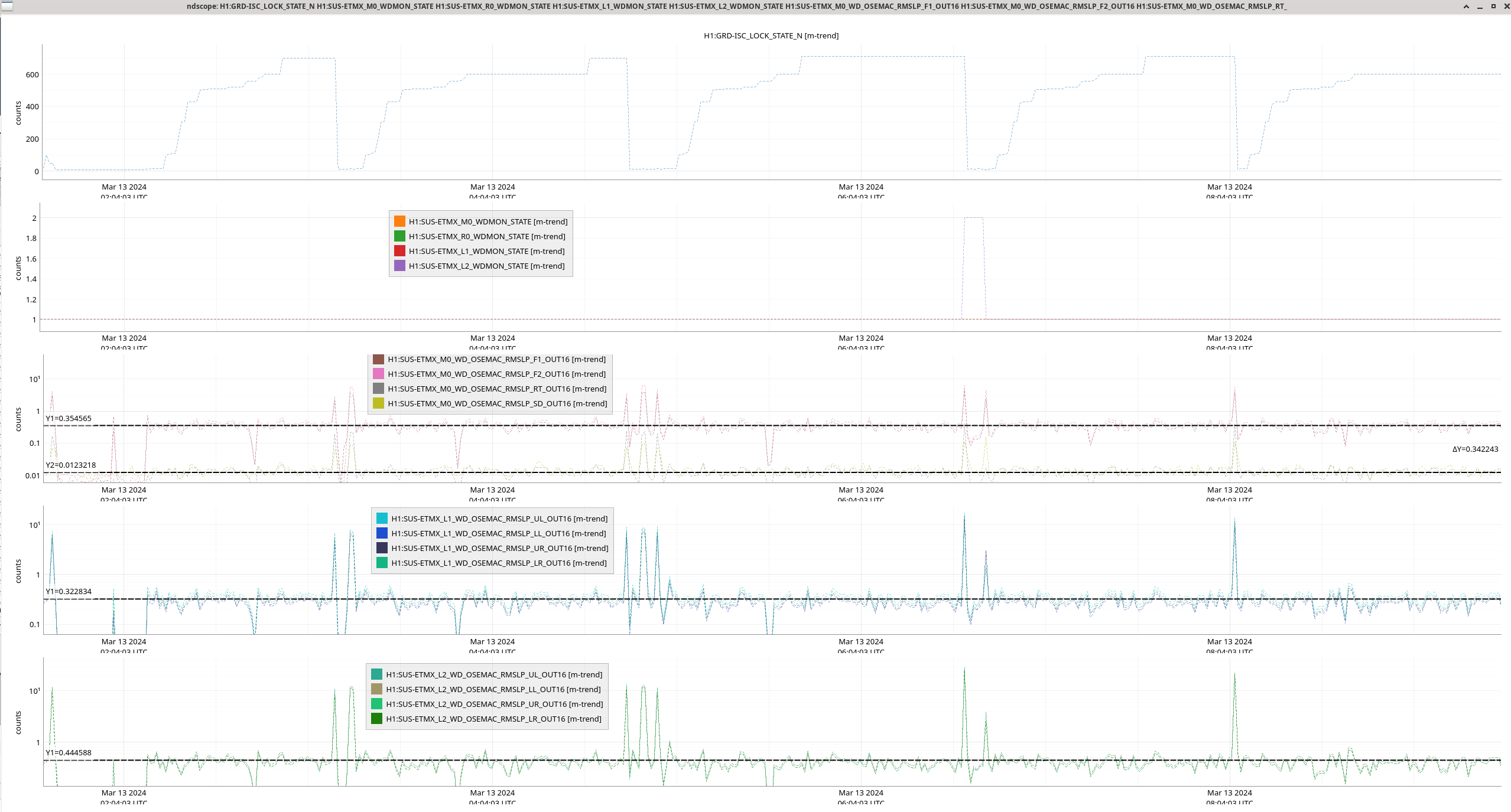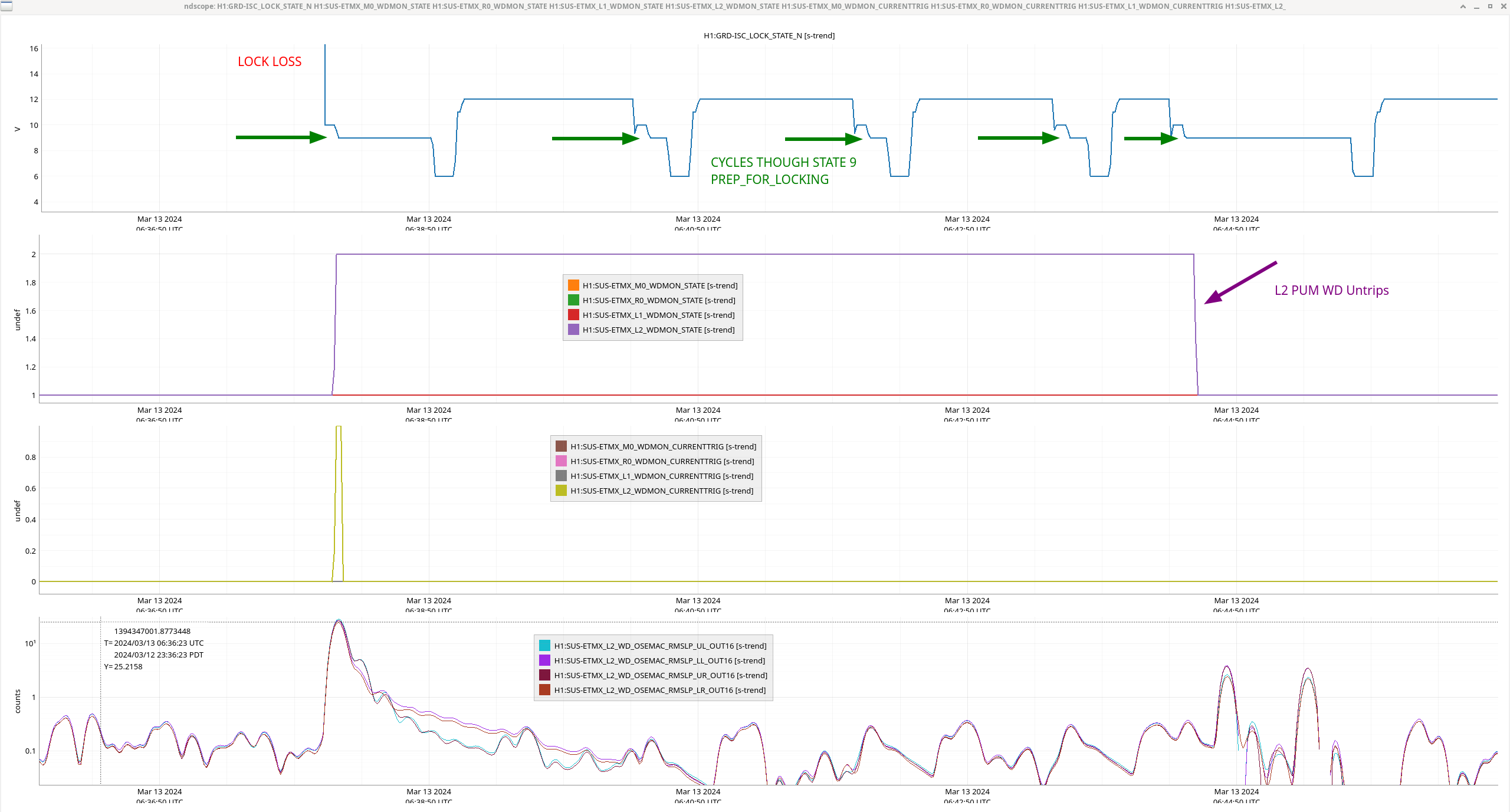E. Capote, L. Dartez, J. Kissel, R. Short As you know, Oli and I installed a revamped watchdog system on the ETMs yesterday (LHO:76305). In doing so, we arbitrarily set the watchdog threshold for all stages at 25 [um_RMS] (over the 0.1 to 10 Hz band). Elenna and Louis reported yesterday evening that we had *one* WD trip of the PUM stage after the lock-loss of the fourth of four successful locks (see the last phrase of the last sentence in LHO:76315). Further, they were concerned because, apparently, "the watchdog reset itself." To the first point -- that there even was a watchdog trip -- the first attachment shows - The ISC_LOCK guardian state (H1:GRD-ISC_LOCK_STATE_N), remeber 600 is NOMINAL_LOW_NOISE - The 4 stages of OSEM watchdog "is it tripped?" channels (H1:SUS-ETMX_??_WDMON_STATE, with ?? = M0, R0, L1, and L2 for Main Chain and Reaction Chain top stages, the UIM and PUM stages) - The 4 stages of OSEM watchdog "is the trigger actively suggesting it should be tripped?" channels (H1:SUS-ETMX_??_WDMON_CURRENTTRIG) - The PUM (L2) stage BLRMS trigger signals themselves, now for the first time in physical units! (H1:SUS-ETMX_L2_WD_OSEMAC_RMSLP_??_OUT16) One can see that lock losses are typically kicking the PUM, up to 10-20 [um_RMS], but otherwise, the quiescent BLRMS is around 0.5 [um_RMS]. To the second point -- we're still investigating, but the second attachment shows that the PUM WD is reset (H1:SUS-ETMX_L2_WDMON_STATE goes from 2 to 1) at 2024-03-13 06:44:32 UTC. In general, the guardian systems has been build on the axiom of "GUARDIAN SHALL NOT TOUCH WATCHDOGS," so we're quite suspicious of that this was not human-related. The human action that seems to be coincident with the reset on *this* lock acquisition attempt, as opposed to the three attempts immediately prior is that the ISC_LOCK guardian was taken to "INIT." It's not a smoking gun, but it's at least a bread crumb. We'll keep looking. Finally, the third attachment shows an overall assessment of typical maximum values of the BLRMS for all stages. Here's a summary of the assessment in tabular form: Stage Quiescent Average Value Maximum Transient Value [um_RMS] [um_RMS] M0 0.35 6.35 L1 0.32 18.34 L2 0.44 29.02 (where out of laziness and worry of too crowded a plot, I assume R0 has the same behavior.) In the mean time, the watchdog is working exactly as expected, and let's bump up the PUM WD threshold to 30 [um_RMS].