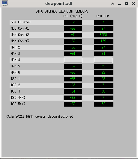 I've updated the dewpoint.adl MEDM to show the decommissioning of HAM 4. Fil found yesterday that the Modular Container #2 sensor is misreading and will be replaced.