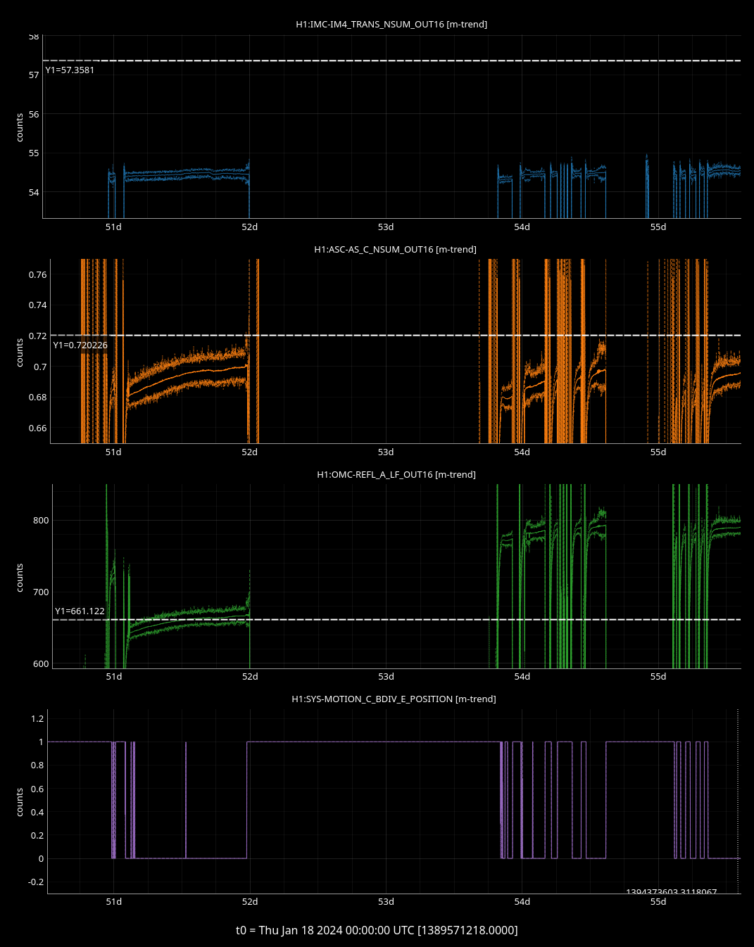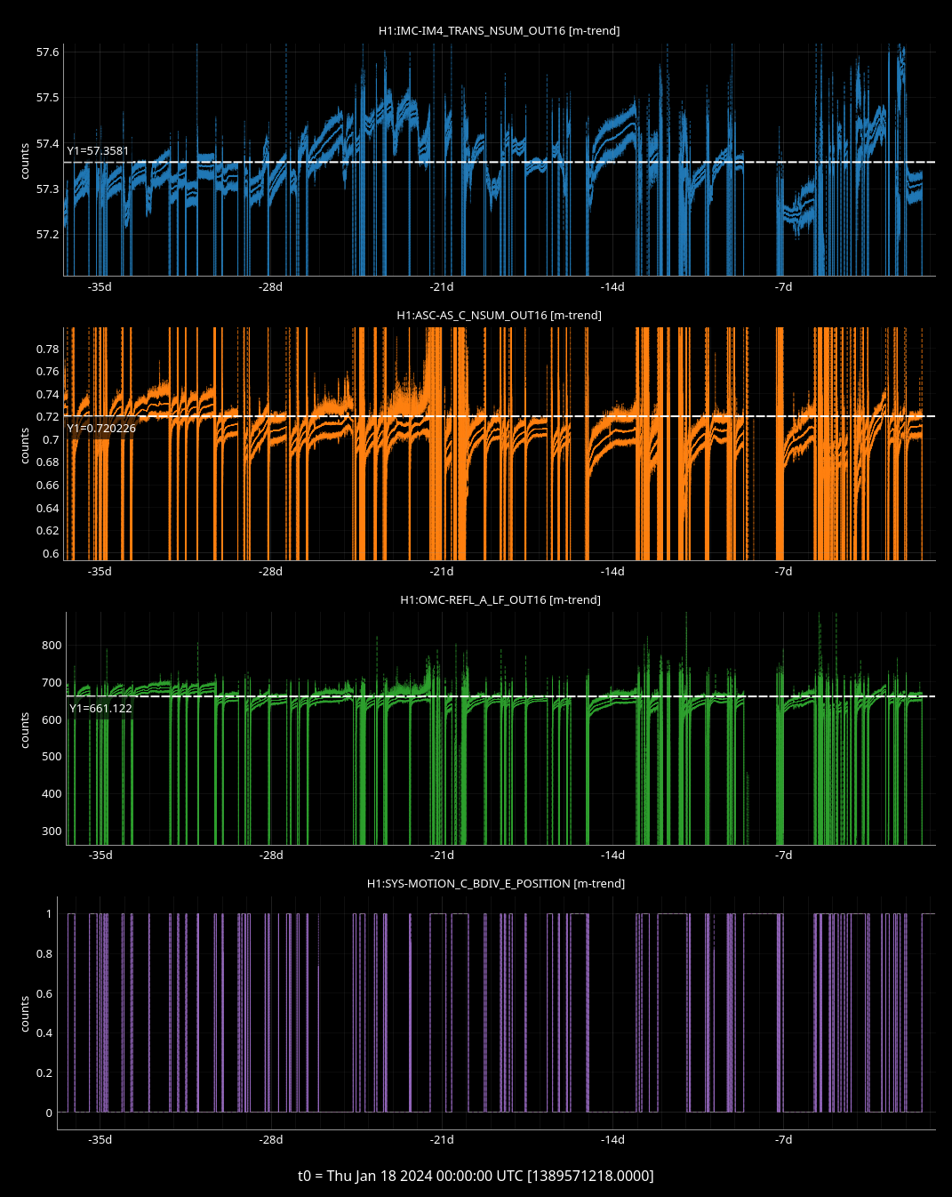 First attached plot is IM4_TRANS, AS_C, OMC_REFL and the squeezer beam diverter during a time in O4A (~Jan 18). Second plot is the same PDs since the break