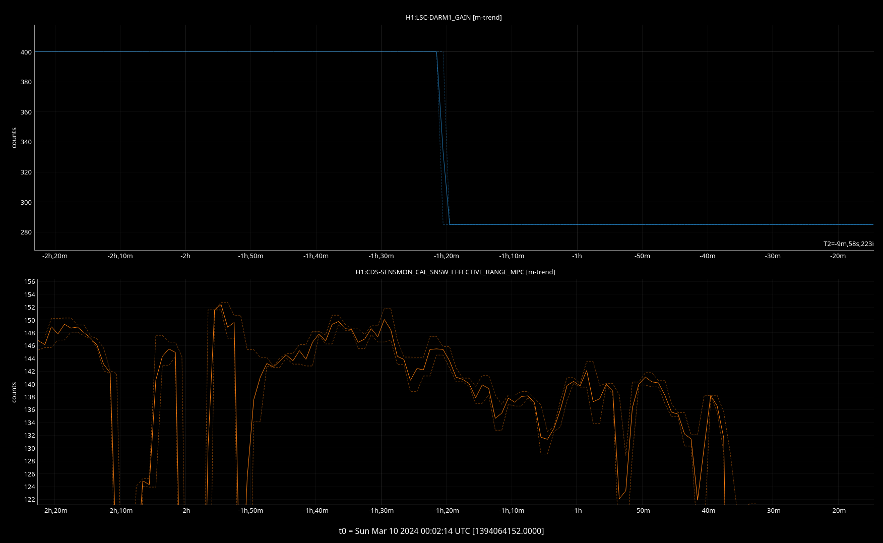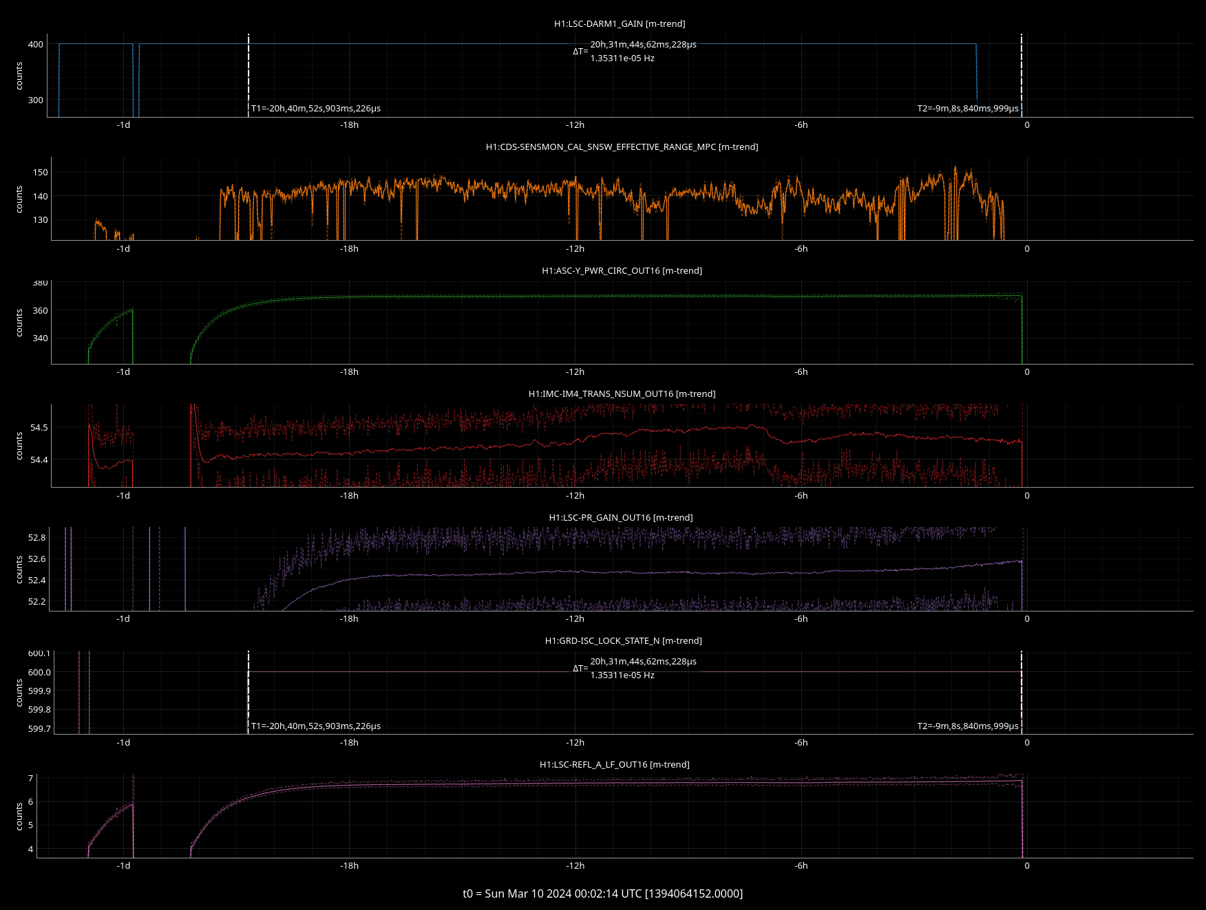 Trending our other signals, just see that OMC_TRANS_RF3 and CLF_REFL_RF6 and FC_WFS_A_ locking signal sare much larger, I think this is expected from increased CLF power. The NLG is simular 15.8 now, was 17.3. Plots of Jan 10th and March 9th.