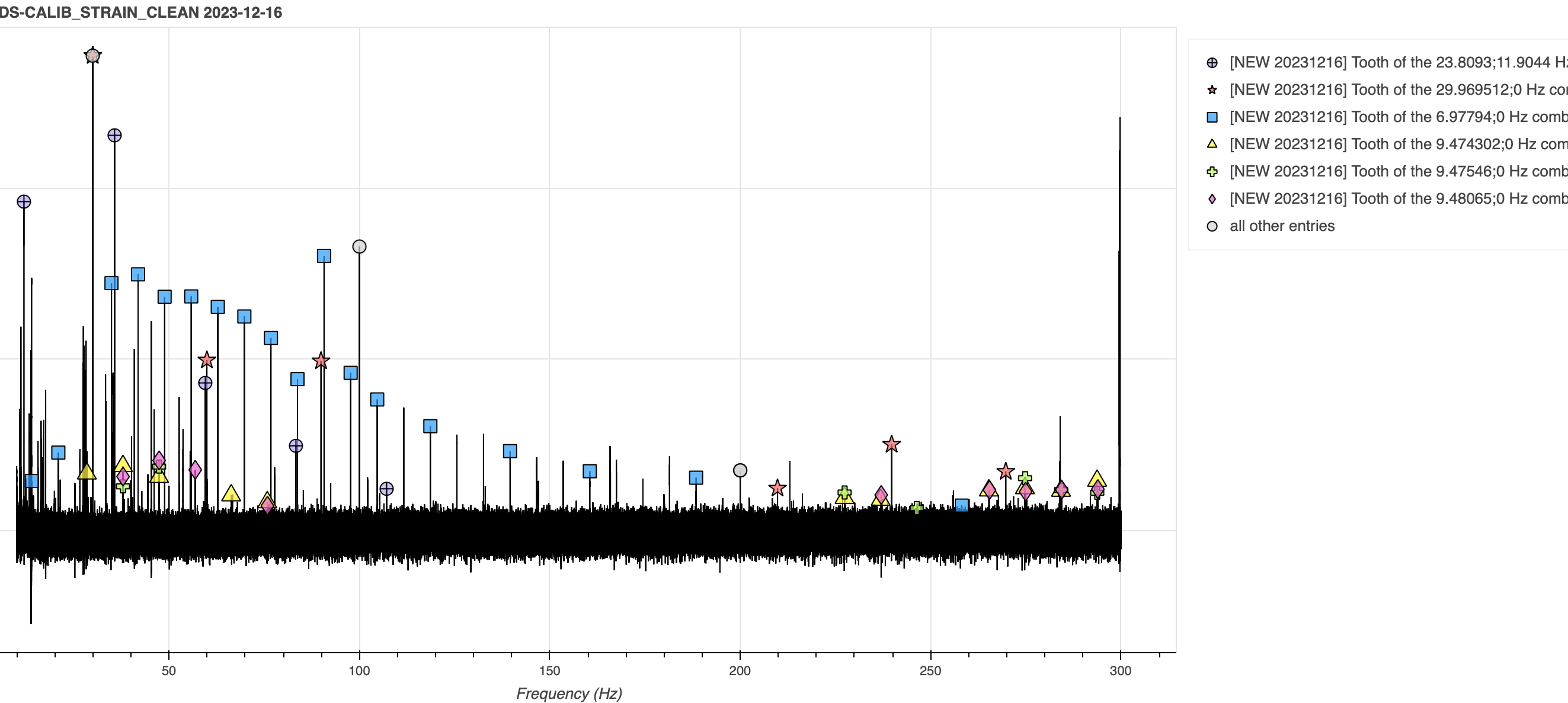 It looks like there was a major change in the 11.9 Hz comb on Nov 1, and then a smaller decrease after Nov 14 and an increase on & after Dec 5. No ideas yet for what might be related, just logging the times. Plot attached shows the height of the n=3 line at 35.71389 Hz over time, in normalized average daily Fscan spectra (so the y-axis is in arbitrary units). Second figure shows the same quantity, but tracked over a much longer time period.