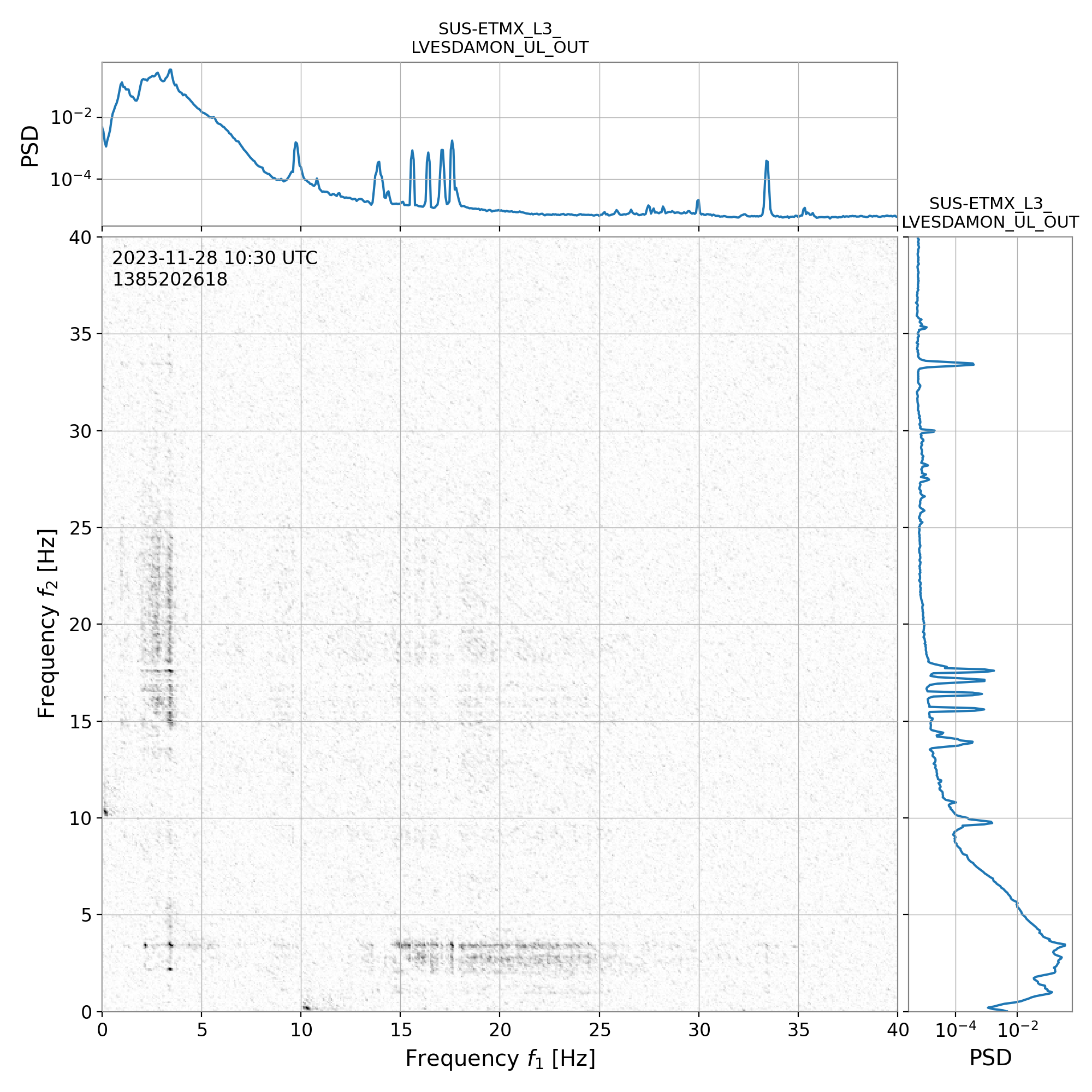 Similarly, one can comput the bicoherence of the triplet (ESD, ESD, DARM), so that the 2d plot shows how ESD(f_1) * ESD(f_2) contributes to DARM(f_1+f_2). There is strong bicoherence of the low frequency ESD signal with DARM at frequencies above 10 Hz.