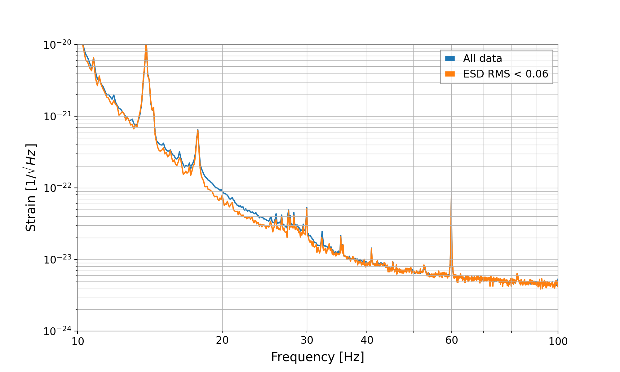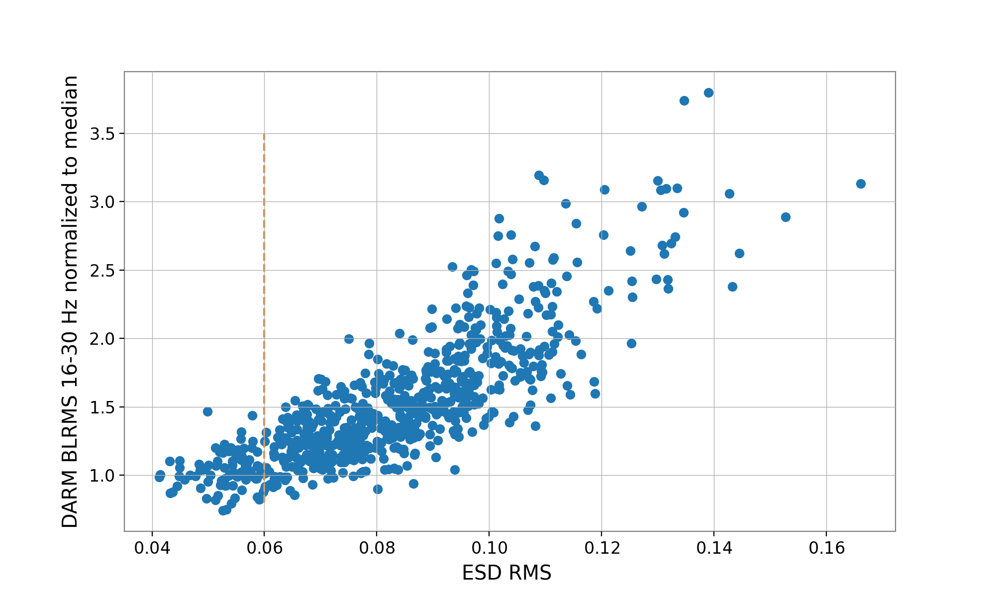 One can select all times when the ESD RMS is below 0.06 (in the units of the scatter plot) and average DARM during those times. A comparison with an average over all times gives us an idea of how much DARM could be improved by reducing the ESD drive (if the non-linear noise behavior is due to the ESD, as we believe).
