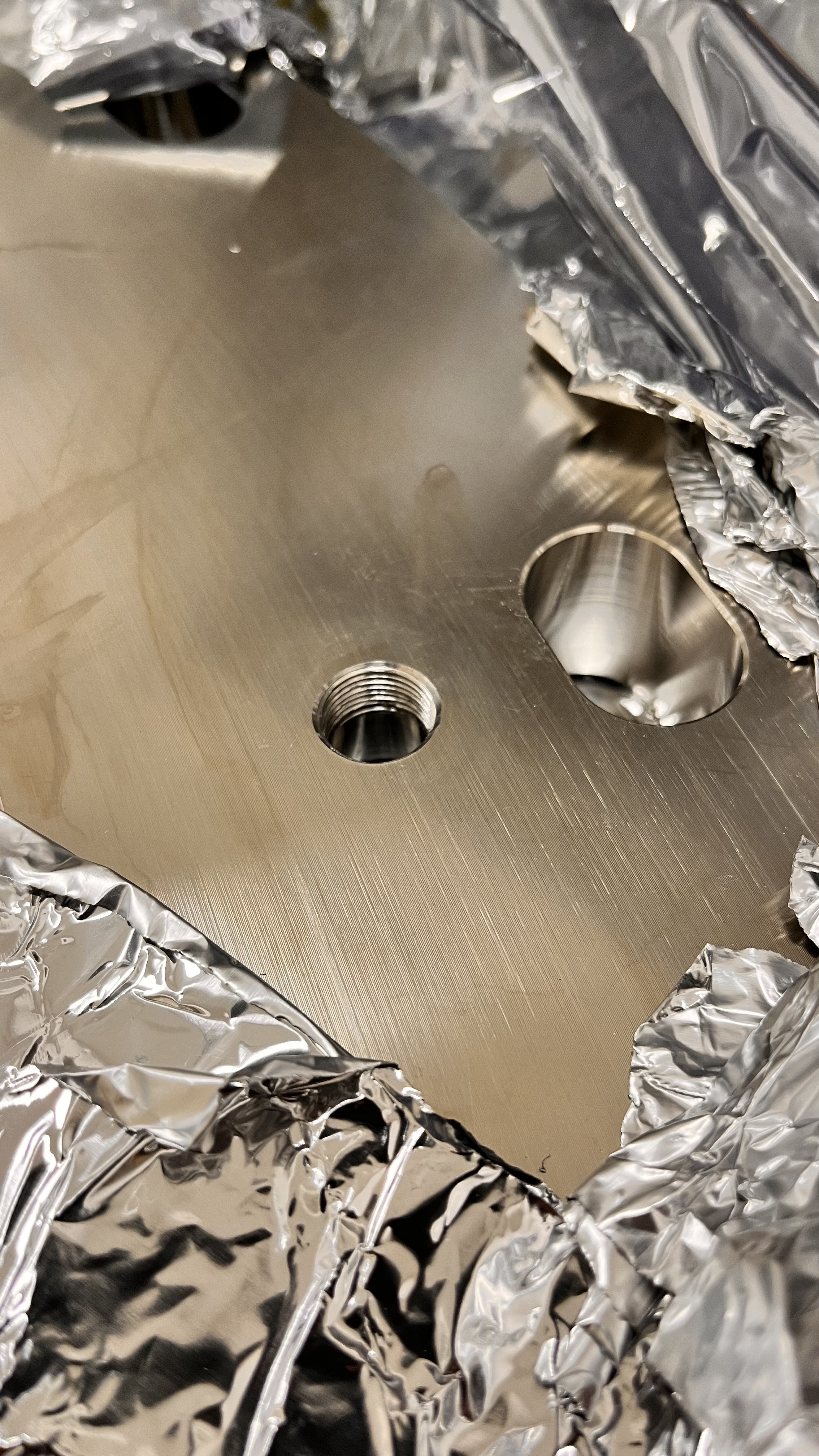 After flipping the septum carefully with the forklift to get to the non-grooved side, the new door for HAM7 +X side got new threads on what it used to be the annulus thru hole. Now, the door is in queue to get cleaned. We used this aLOG as a guide, as well as the following drawing taken from the DCC D1900512. Only IPA alcohol was used to cut the threads.